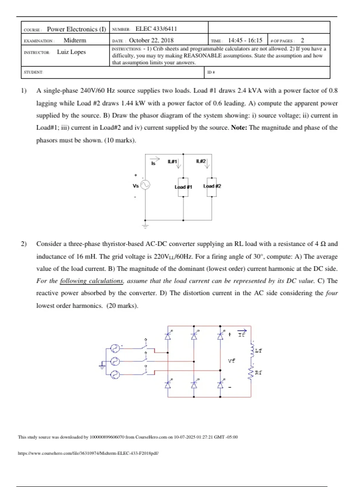 COURSE : Power Electronics (I) NUMBER: ELEC 433/6411 EXAMINATION : Midterm DATE : October 22, 2018 TIME : 14:45 - 16:15 # OF PAGES : 2 INSTRUCTOR: Luiz Lopes INSTRUCTIONS: - 1) Crib sheets and programmable calculators are not allowed. 2) If you have a difficulty, you may try making REASONABLE assumptions. State the assumption and how that assumption limits your answers. STUDENT: ID # 1) A single-phase 240V/60 Hz source supplies two loads. Load #1 draws 2.4 kVA with a power factor of 0.8 lagging while Load #2 draws 1.44 kW with a power factor of 0.6 leading. A) compute the apparent power supplied by the source. B) Draw the phasor diagram of the system showing: i) source voltage; ii) current in Load#1; iii) current in Load#2 and iv) current supplied by the source. Note: The magnitude and phase of the phasors must be shown. (10 marks). 2) Consider a three-phase thyristor-based AC-DC converter supplying an RL load with a resistance of 4 Ω and inductance of 16 mH. The grid voltage is 220VLL/60Hz. For a firing angle of 30°, compute: A) The average value of the load current. B) The magnitude of the dominant (lowest order) current harmonic at the DC side. For the following calculations, assume that the load current can be represented by its DC value. C) The reactive power absorbed by the converter. D) The distortion current in the AC side considering the four lowest order harmonics. (20 marks). This study source was downloaded by from CourseH on :27:21 GMT -05:00 3) A semi-controlled (thyristor-diode hybrid) AC-DC converter is shown below. Assume that the thyristors are fired with the same firing angle (α) and that the load is “highly inductive”. A) Explain how the converter operates, that is, when each semiconductor turns ON and OFF. B) Draw 2 line cycles of the following waveforms for α = 45°: i) Source voltage, ii) load voltage, iii) load current and iv) source current. C) Derive an expression for the average voltage across the load as a function of the rms value of the source voltage (Vs) and firing angle of the thryristor (α). (15 marks). D1 D2 THY1 THY2 + Vs - + Vd - Is Id 4) Considering the circuit below