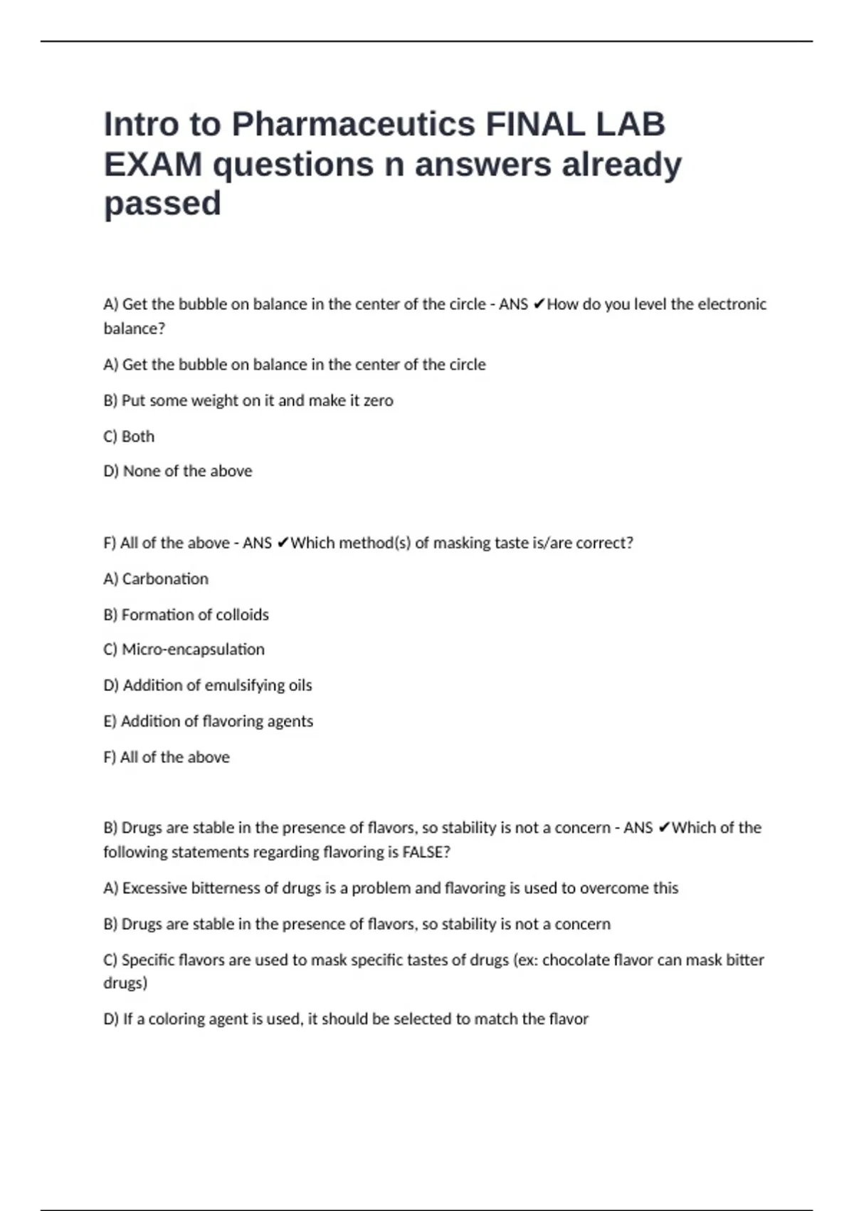 Intro to Pharmaceutics FINAL LAB EXAM questions n answers already passed