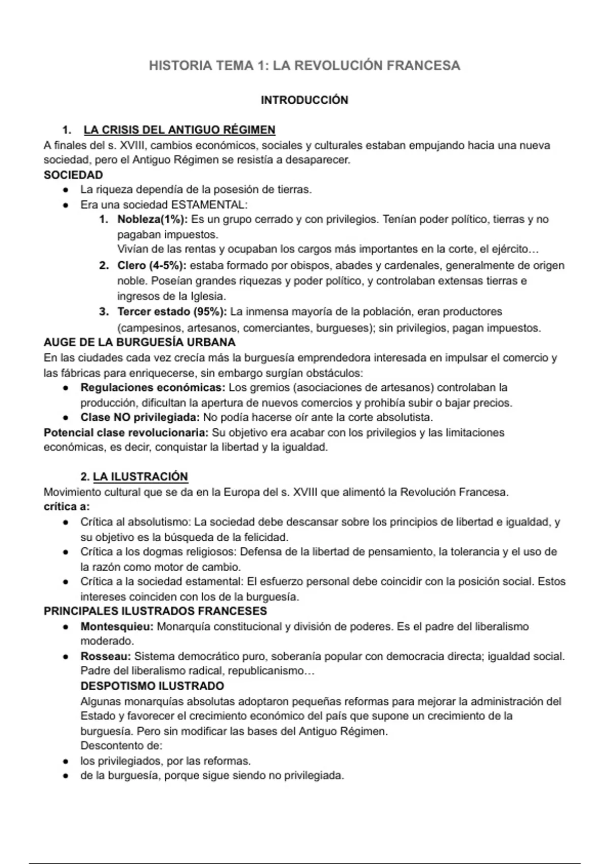Resumen limpio, sin subrayar, de 5 páginas sobre la Revolución francesa. Nivel 1º de Bachillerato, curso 25/26