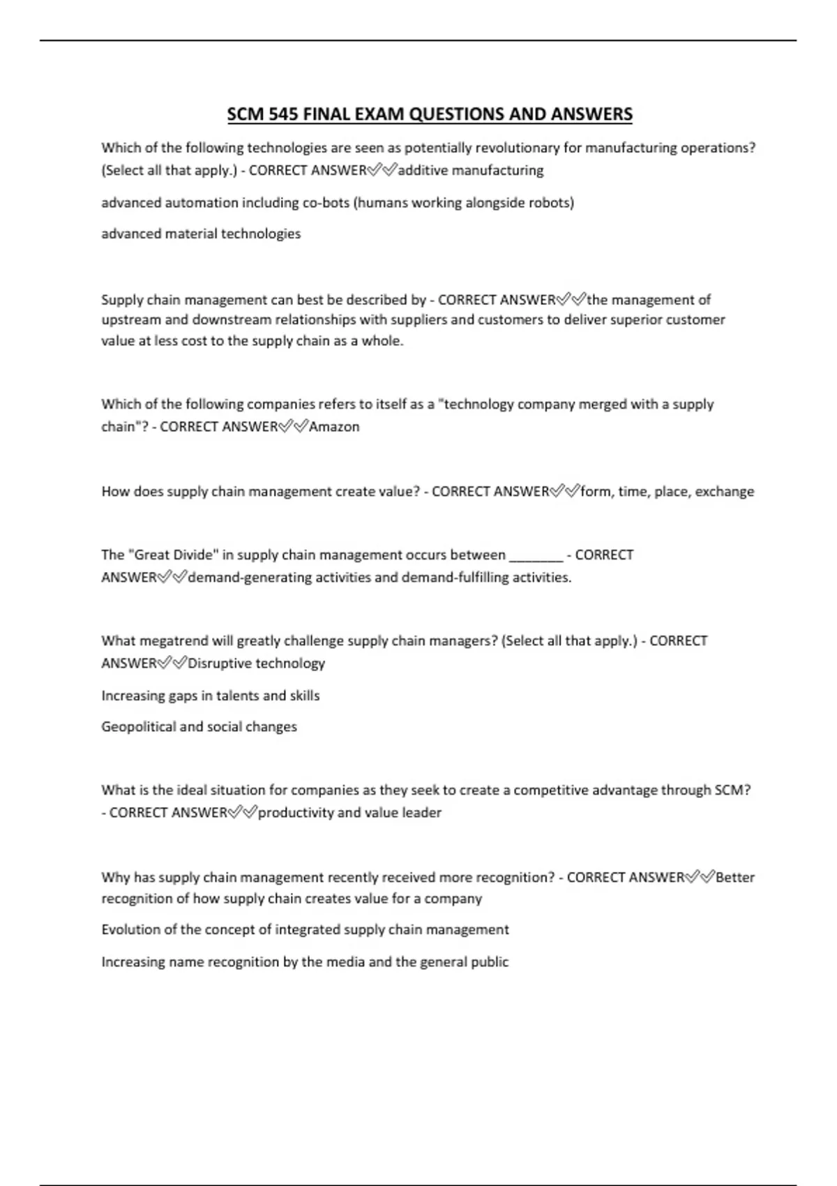 SCM 545 FINAL EXAM QUESTIONS AND ANSWERS
