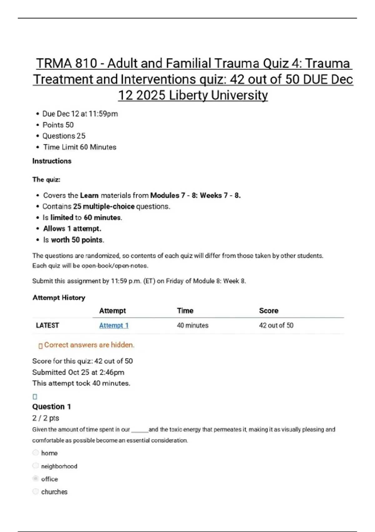 TRMA 810 - Adult and Familial Trauma Quiz 4: Trauma Treatment and Interventions quiz: 42 out of 50 DUE Dec 12 2025 Liberty University