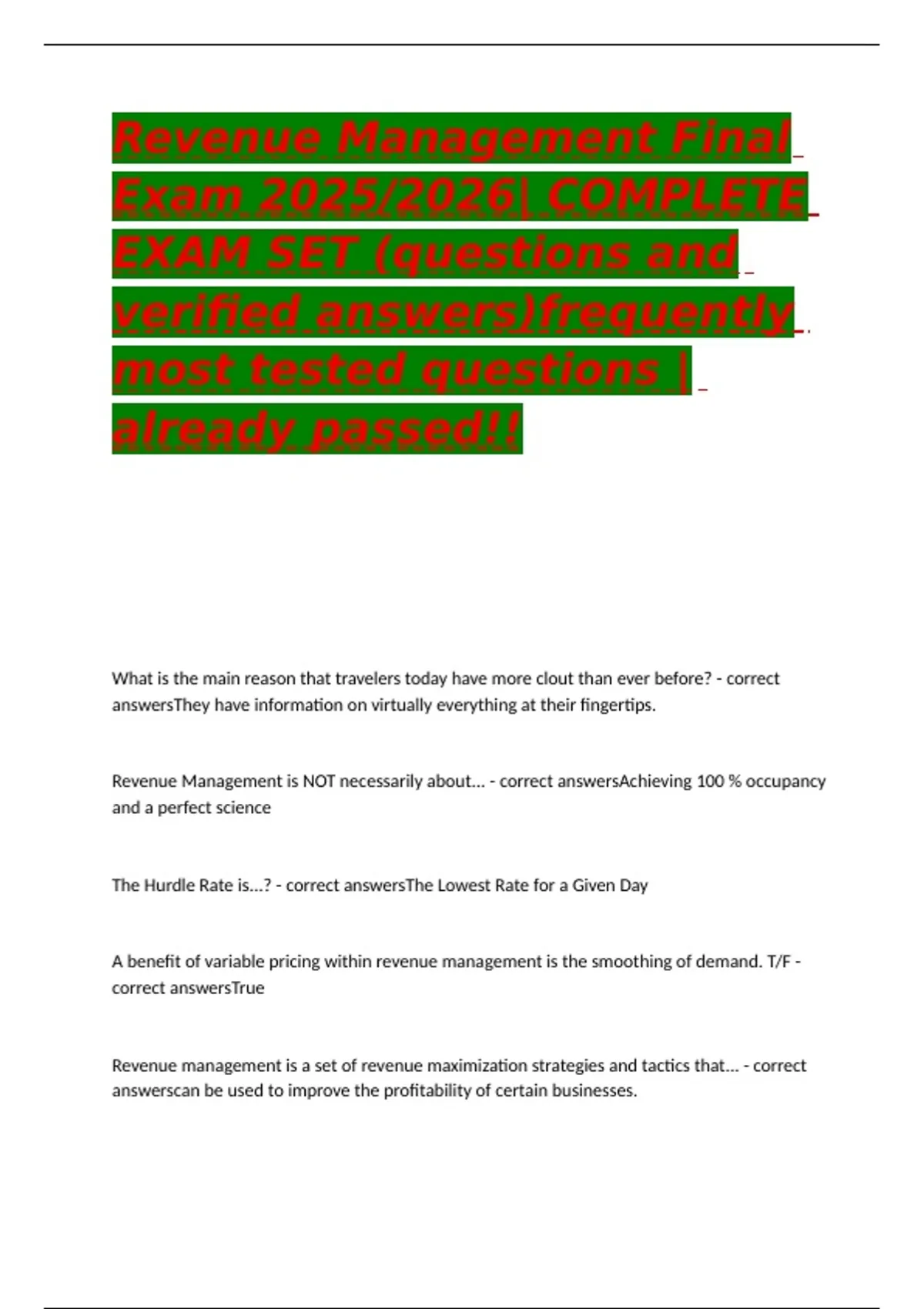 Revenue Management is NOT necessarily about... - correct answersAchieving 100 % occupancy