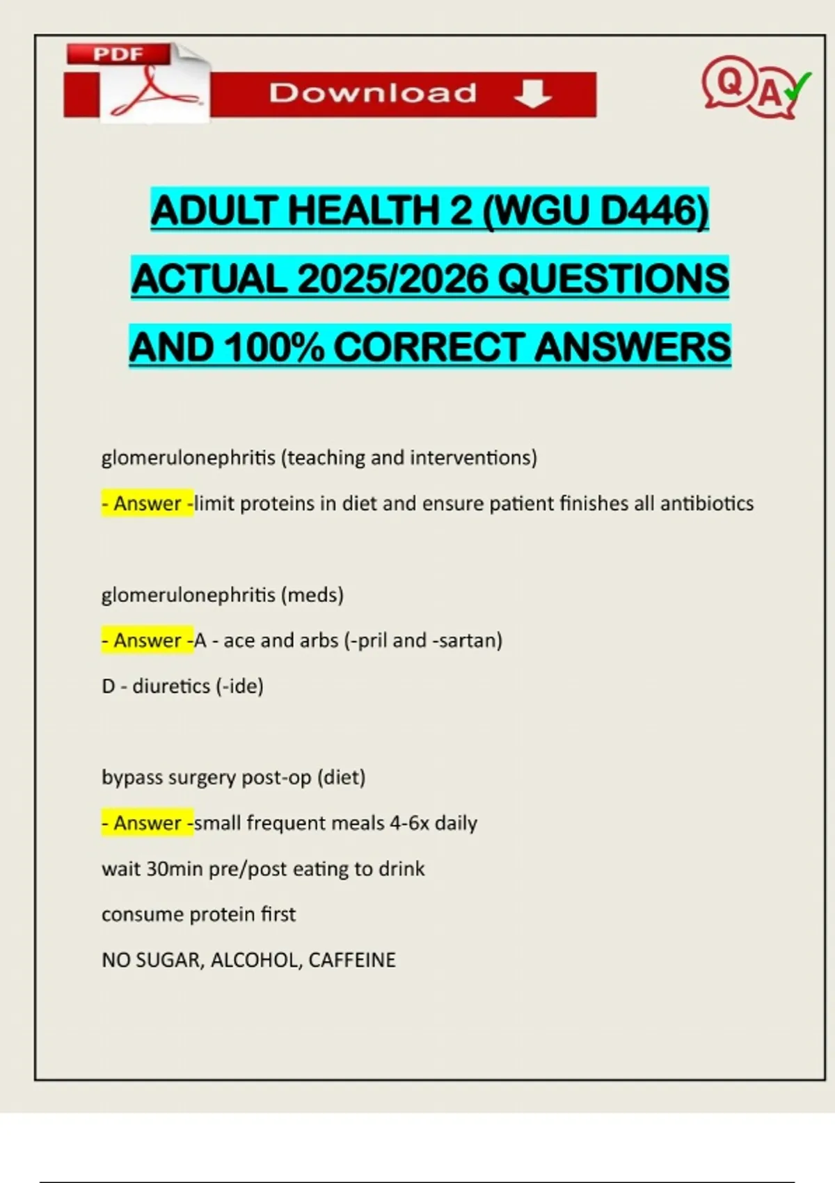ADULT HEALTH 2 (WGU D446) ACTUAL 2025/2026 QUESTIONS AND 100% CORRECT ANSWERS glomerulonephritis (teaching and interventions) - Answer -limit proteins in diet and ensure patient finishes all antibiotics glomerulonephritis (meds) - Answer -A - ace and arbs (-pril and -sartan) D - diuretics (-ide) bypass surgery post-op (diet) - Answer -small frequent meals 4-6x daily wait 30min pre/post eating to drink consume protein first NO SUGAR, ALCOHOL, CAFFEINENeed assistance on Online classes, Exams & Assignments? Reach out for instant help!! Full Course Assistance, Plagiarism-free Essay Writing, Research Paper, Dissertation, Discussion Posts, etc…. Confidential & Secure services. Tutors are available for all subjects! Email now at: liquid diet first 48hrs then pureed diet for 1month bypass surgery post-op (teaching) - Answer -pouch holds 1-2oz at a time (size of egg) NO NSAIDS will need to consume multivitamins and supplements (B12, calciu