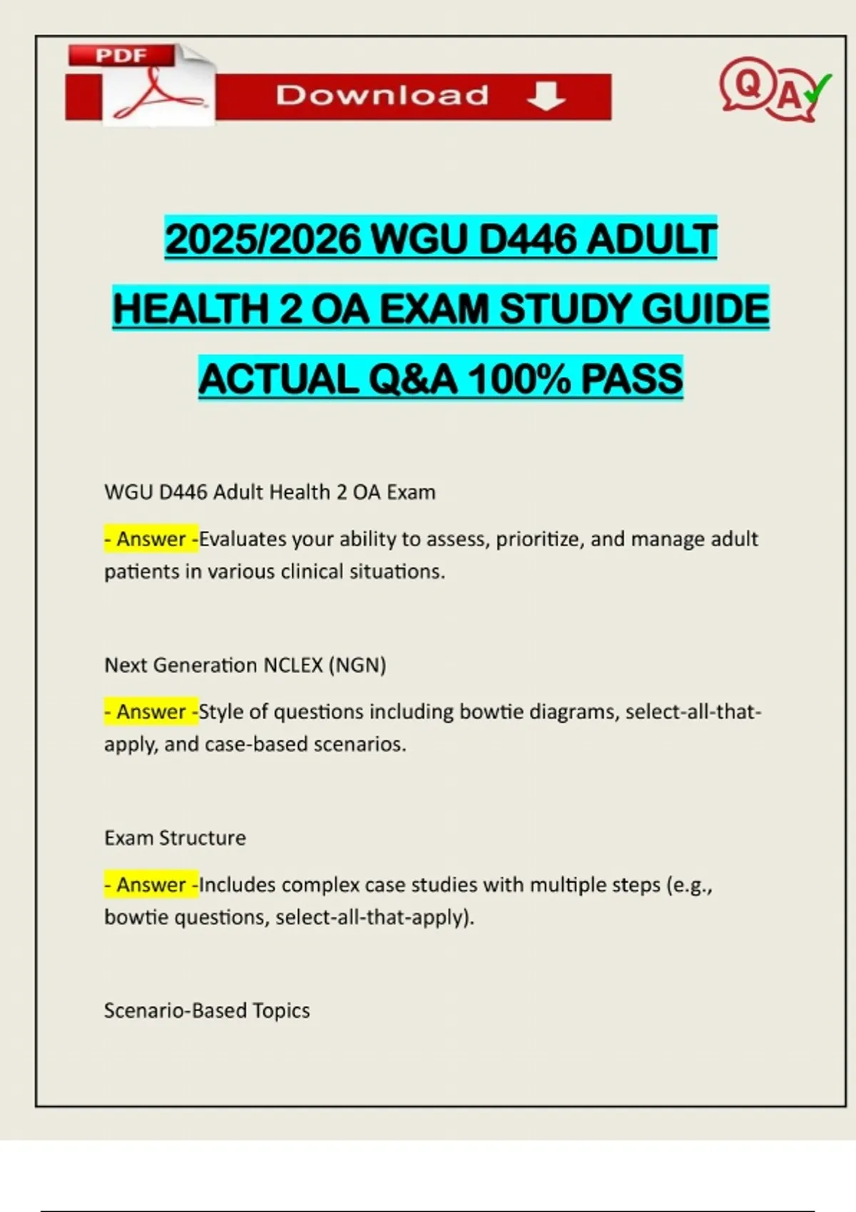 2025/2026 WGU D446 ADULT HEALTH 2 OA EXAM STUDY GUIDE ACTUAL Q&A 100% PASS WGU D446 Adult Health 2 OA Exam - Answer -Evaluates your ability to assess, prioritize, and manage adult patients in various clinical situations. Next Generation NCLEX (NGN) - Answer -Style of questions including bowtie diagrams, select-all-thatapply, and case-based scenarios. Exam Structure - Answer -Includes complex case studies with multiple steps (e.g., bowtie questions, select-all-that-apply). Scenario-Based TopicsNeed assistance on Online classes, Exams & Assignments? Reach out for instant help!! Full Course Assistance, Plagiarism-free Essay Writing, Research Paper, Dissertation, Discussion Posts, etc…. Confidential & Secure services. Tutors are available for all subjects! Email now at: - Answer -Real-world nursing applications like stroke care, cardiac interventions, and fluid management. Clinical Prioritization - Answer -Focus on life-threatening conditions (e.g., MVA with absent breath sounds, heart attack vs. chest pain). Asthma - Answer -Recognize signs of exacerbation: increased mucus, dyspnea during exercise