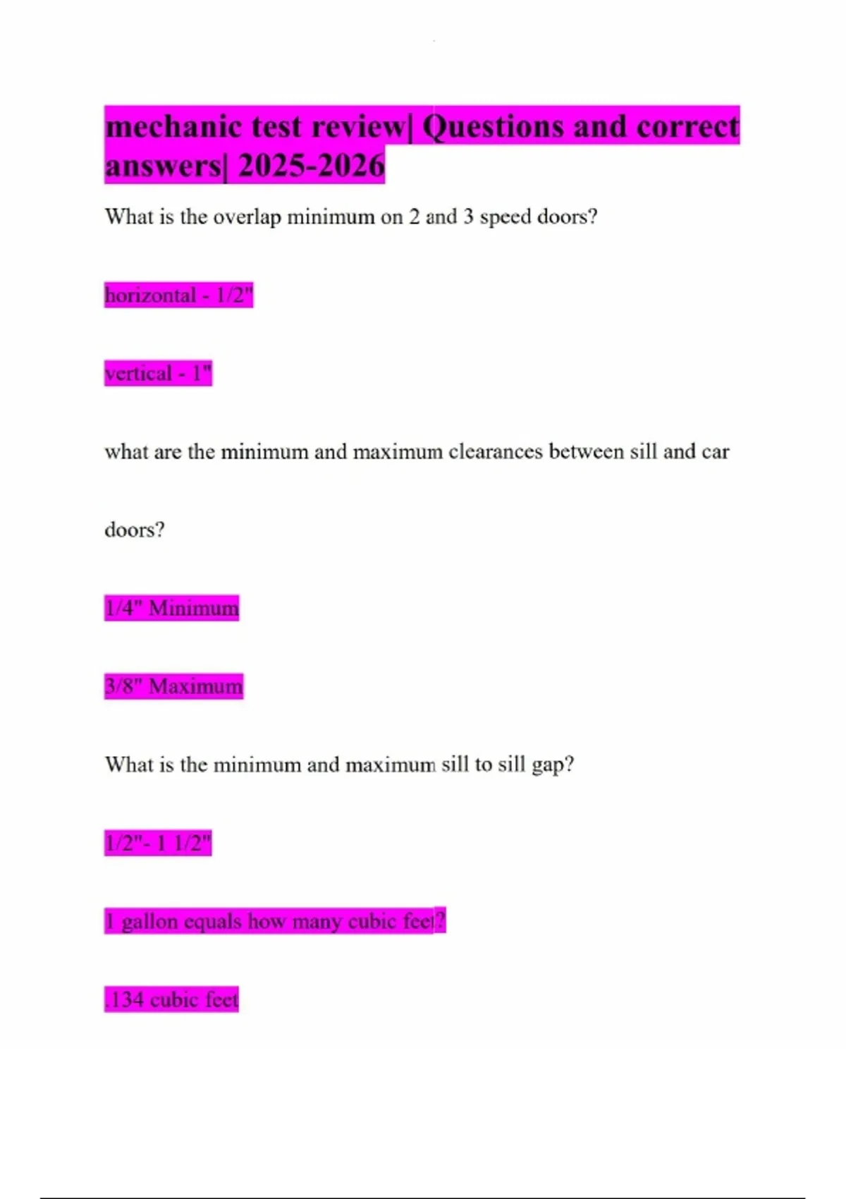 mechanic test review| Questions and correct answers| What is the overlap minimum on 2 and 3 speed doors? horizontal - 1/2" vertical - 1" what are the minimum and maximum clearances between sill and car doors? 1/4" Minimum 3/8" Maximum What is the minimum and maximum sill to sill gap? 1/2"- 1 1/2" 1 gallon equals how many cubic feet? .134 cubic feet how many gallons are needed to run a plunger 30'? Convert 30' into inches = 360" 3x3x3.14=28.26 28.26x360=10,173.6 10,173.6/231=44.04 gallons what is the conversion for Kg to pounds? 1 Kg = 2.205 pounds what is the purpose of a gear reduction unit on a geared machine? Increased lifting capacity At what speed should the Gov. switch be set to open? Electrical - 90% of tripping speed for 150 -500 fpm. 95% for anything over 500 fpm. at what distance from closed does the gate switch operate? 2" What are the most common features of Load weigh? Control the generator field and inside express operation does a GFCI work? Detects imbalance between hot and neutral wires A motor needs a sleeve bearing replaced, what type of bearing do you need? Friction Bearing (anti-friction bearing = ball bearing) Using binary logic, What dip switches must be on for a 128 bit 30 second timer at 150%?