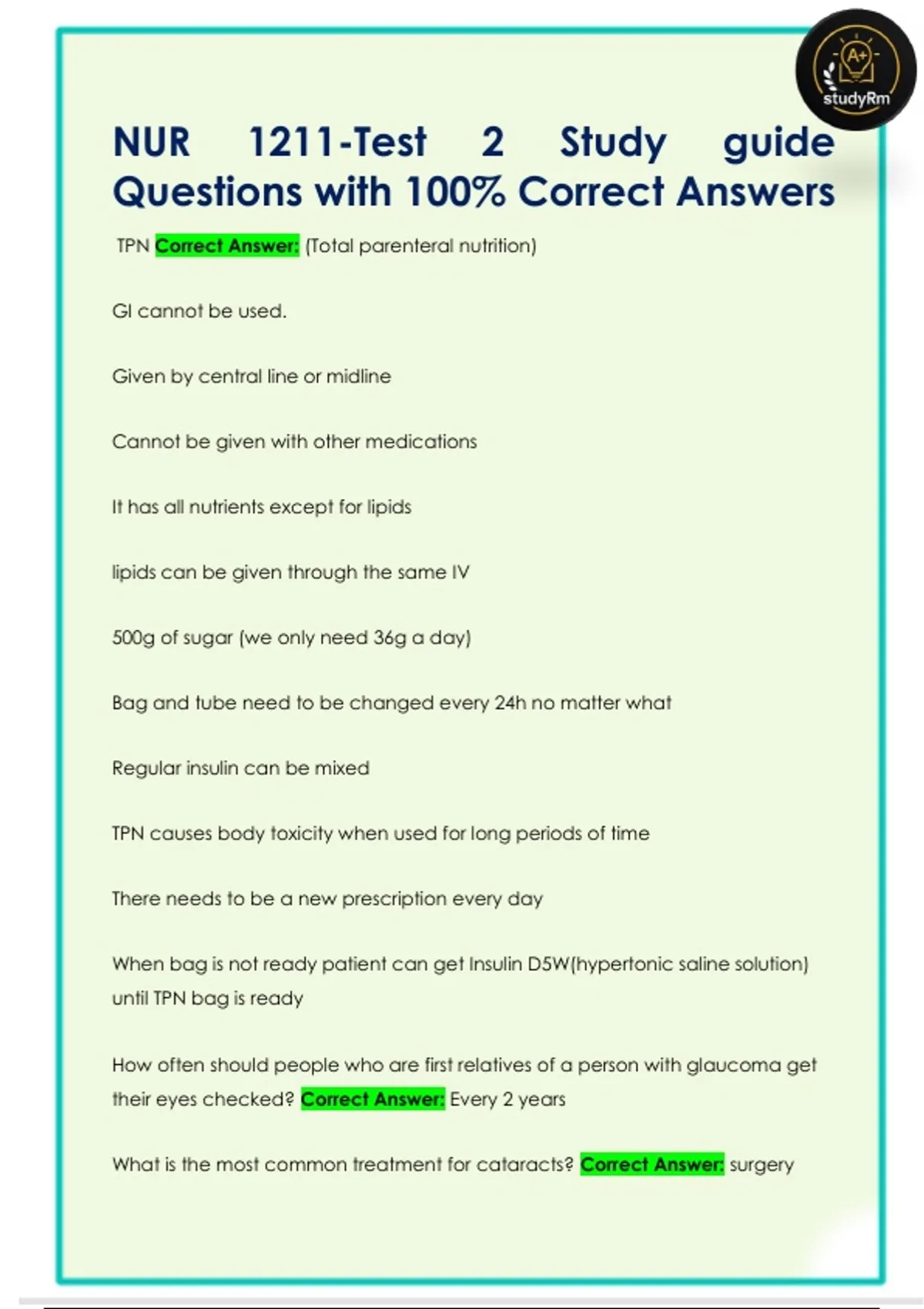 NUR 1211-Test 2 Study guide Questions with 100% Correct Answers