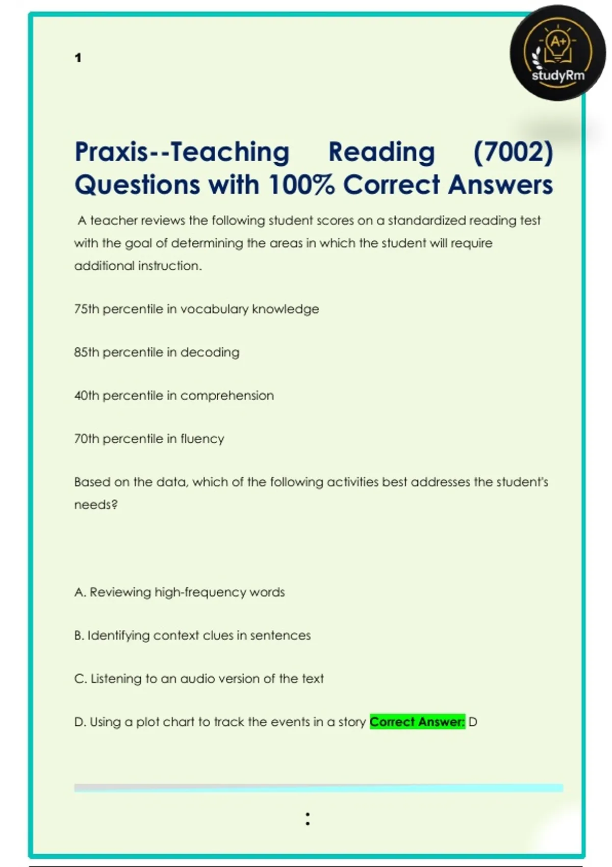 Praxis--Teaching Reading (7002) Questions with 100% Correct Answers