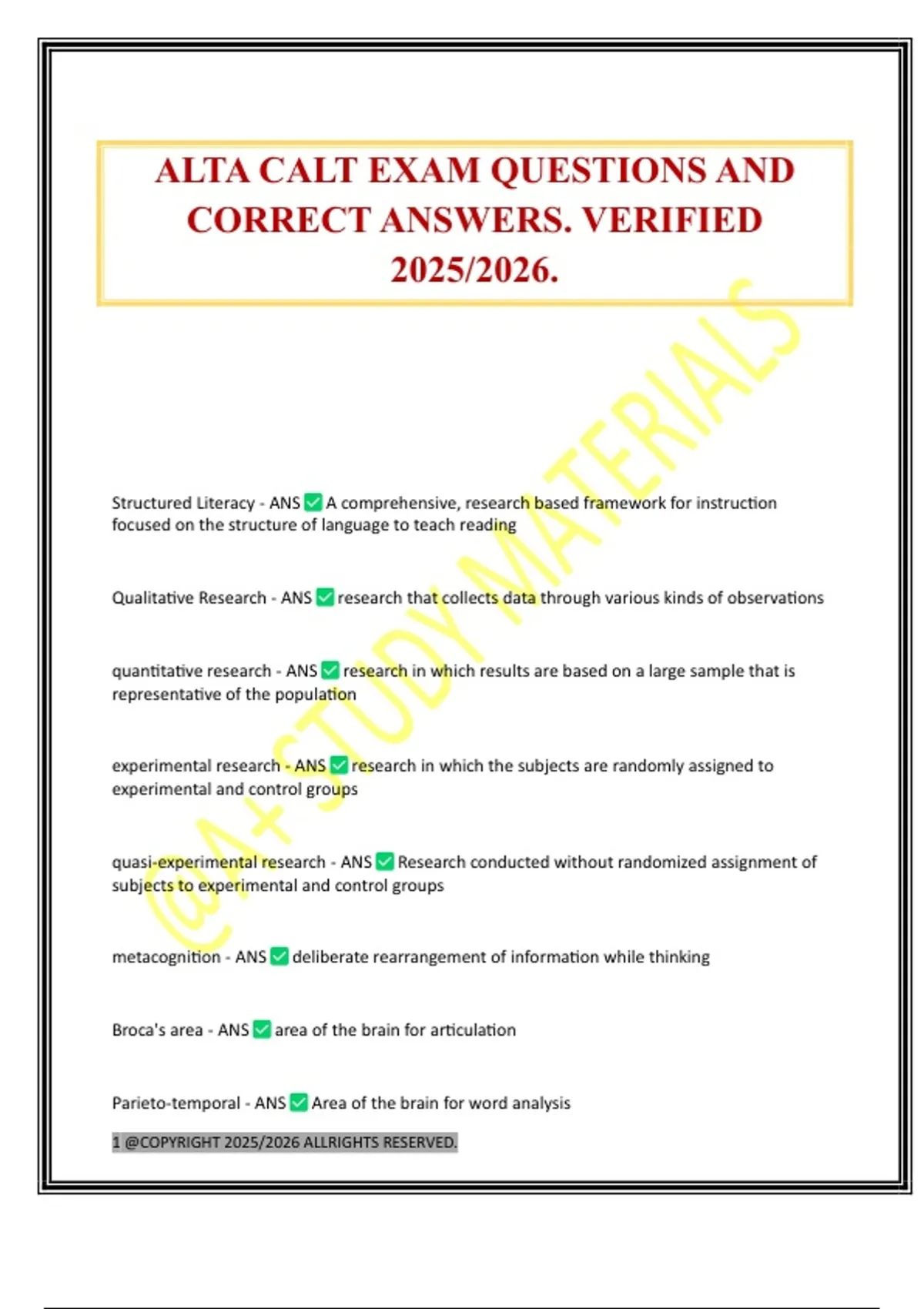 ALTA CALT EXAM QUESTIONS AND