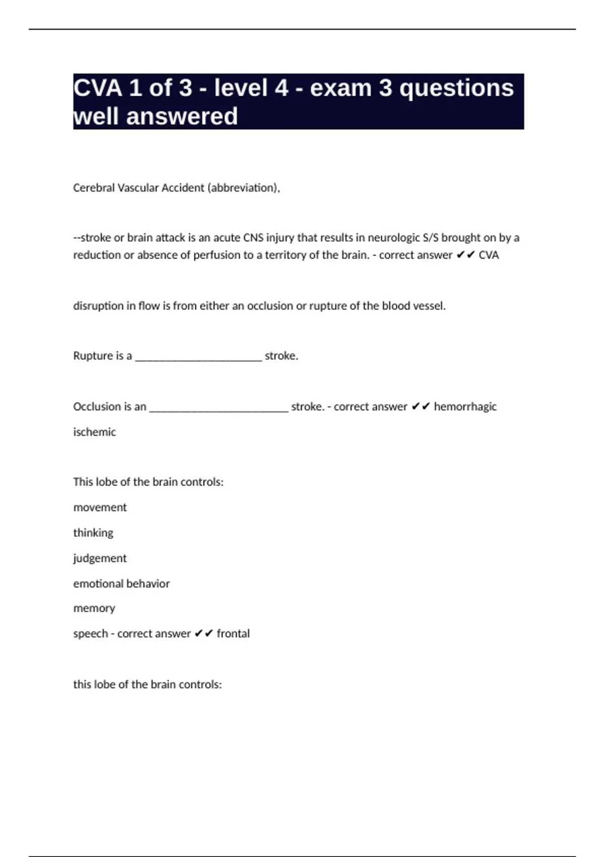 Occlusion is an _______________________ stroke. - correct answer ✔✔ hemorrhagic