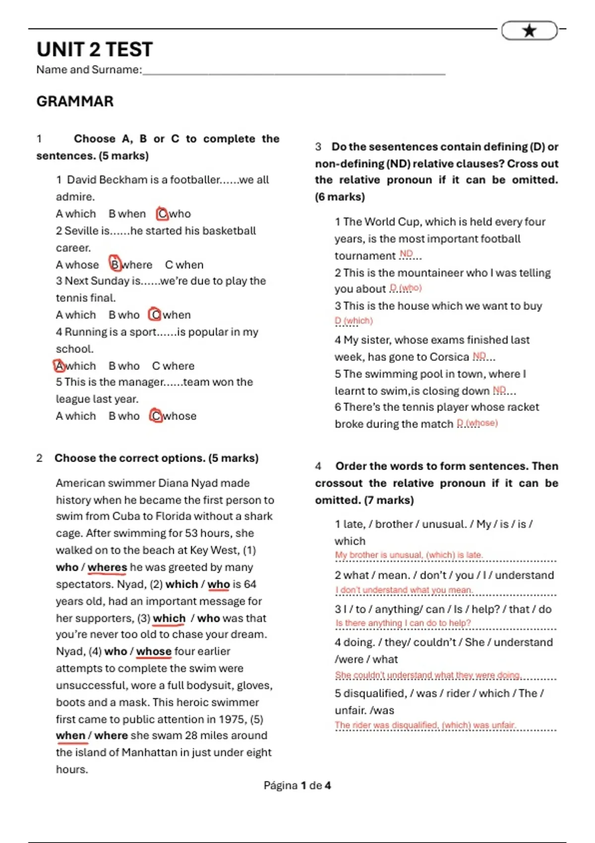 Unit 2 Test answers. 1 Start. editorial Key. 2º Bachillerato, Exámenes de Inglés