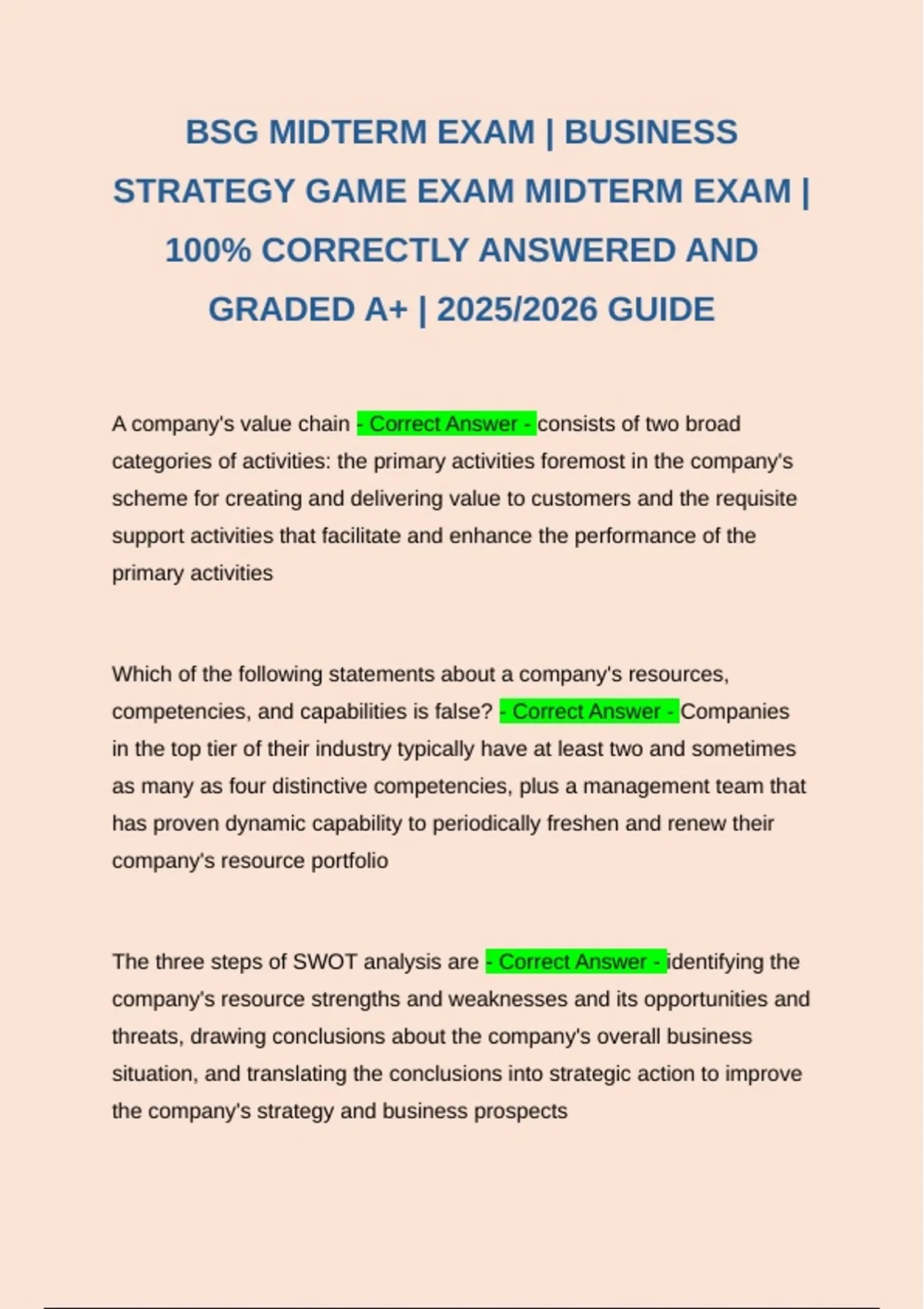 BSG MIDTERM EXAM | BUSINESS STRATEGY GAME EXAM MIDTERM EXAM | 100% CORRECTLY ANSWERED AND GRADED A+ | 2025/2026 GUIDE BSG MIDTERM EXAM | BUSINESS STRATEGY GAME EXAM MIDTERM EXAM | 100% CORRECTLY ANSWERED AND GRADED A+ | 2025/2026 GUIDE