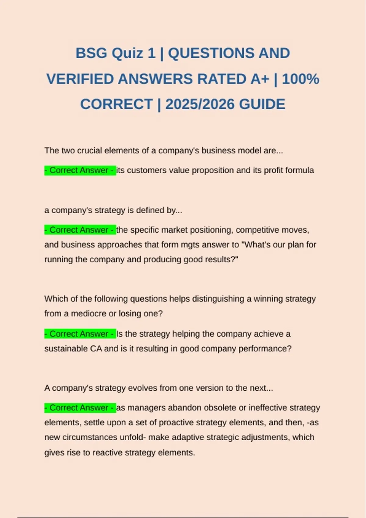 BSG Quiz 1 | QUESTIONS AND VERIFIED ANSWERS RATED A+ | 100% CORRECT | 2025/2026 GUIDE BSG Quiz 1 | QUESTIONS AND VERIFIED ANSWERS RATED A+ | 100% CORRECT | 2025/2026 GUIDE