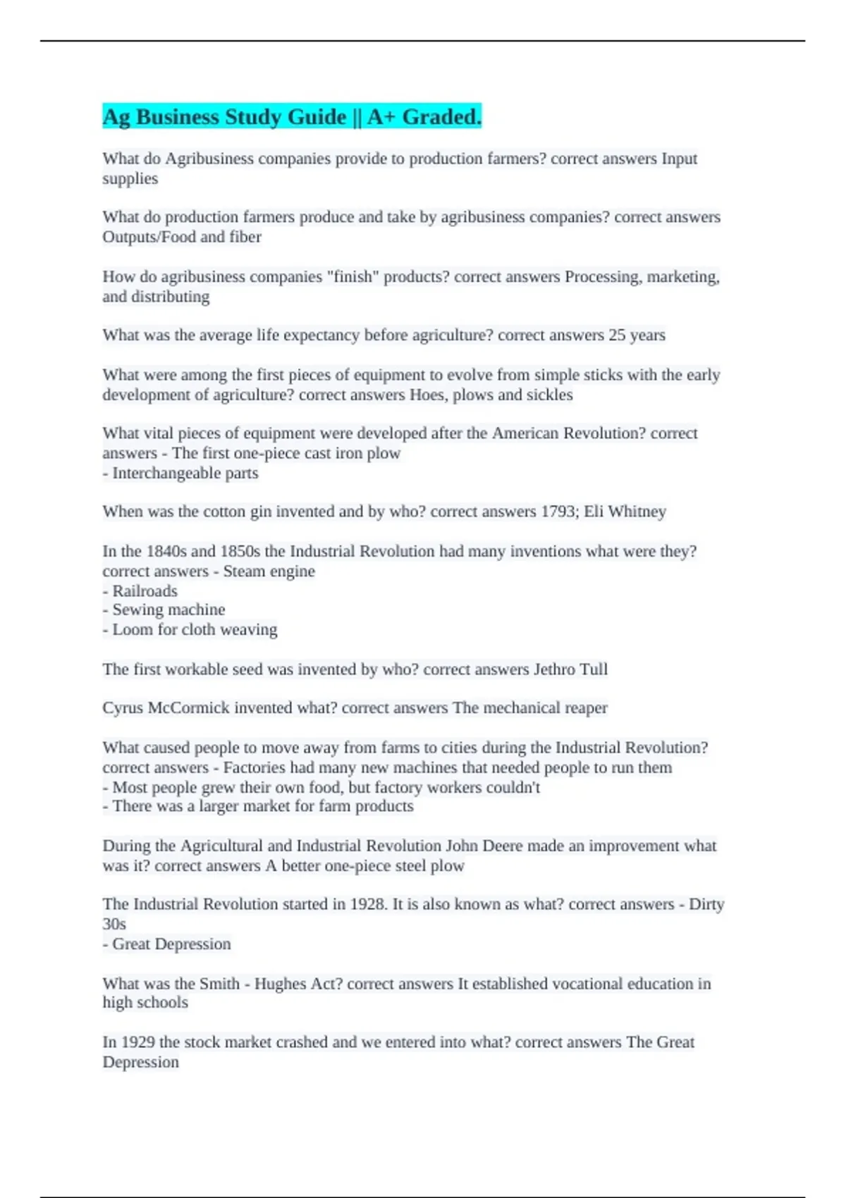 Ag Business Study Guide || A+ Graded.