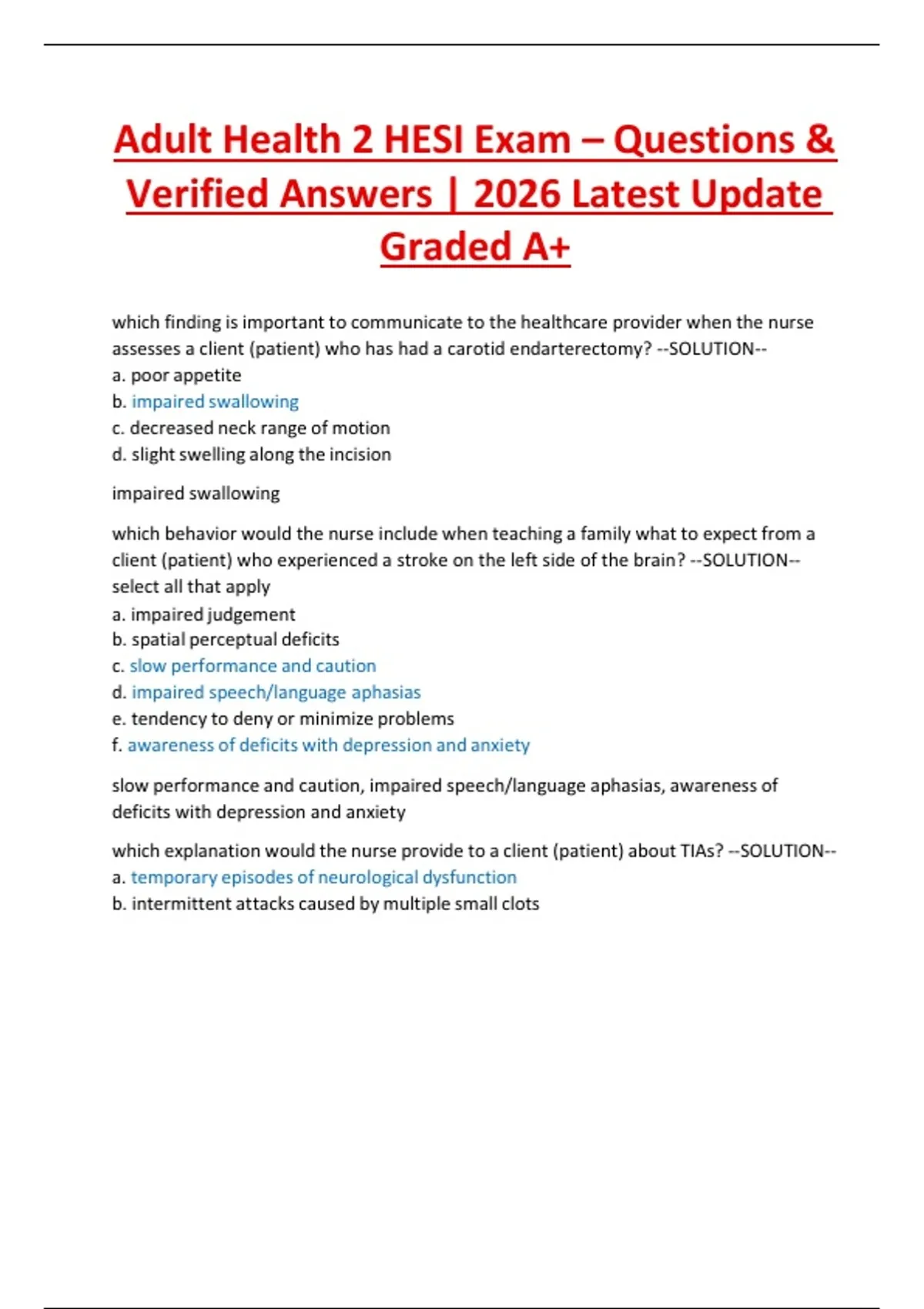 Adult Health 2 HESI Exam – Questions & Verified Answers | 2026 Latest Update Graded A+ Adult Health 2 HESI Exam – Questions & Verified Answers | 2026 Latest Update Graded A+