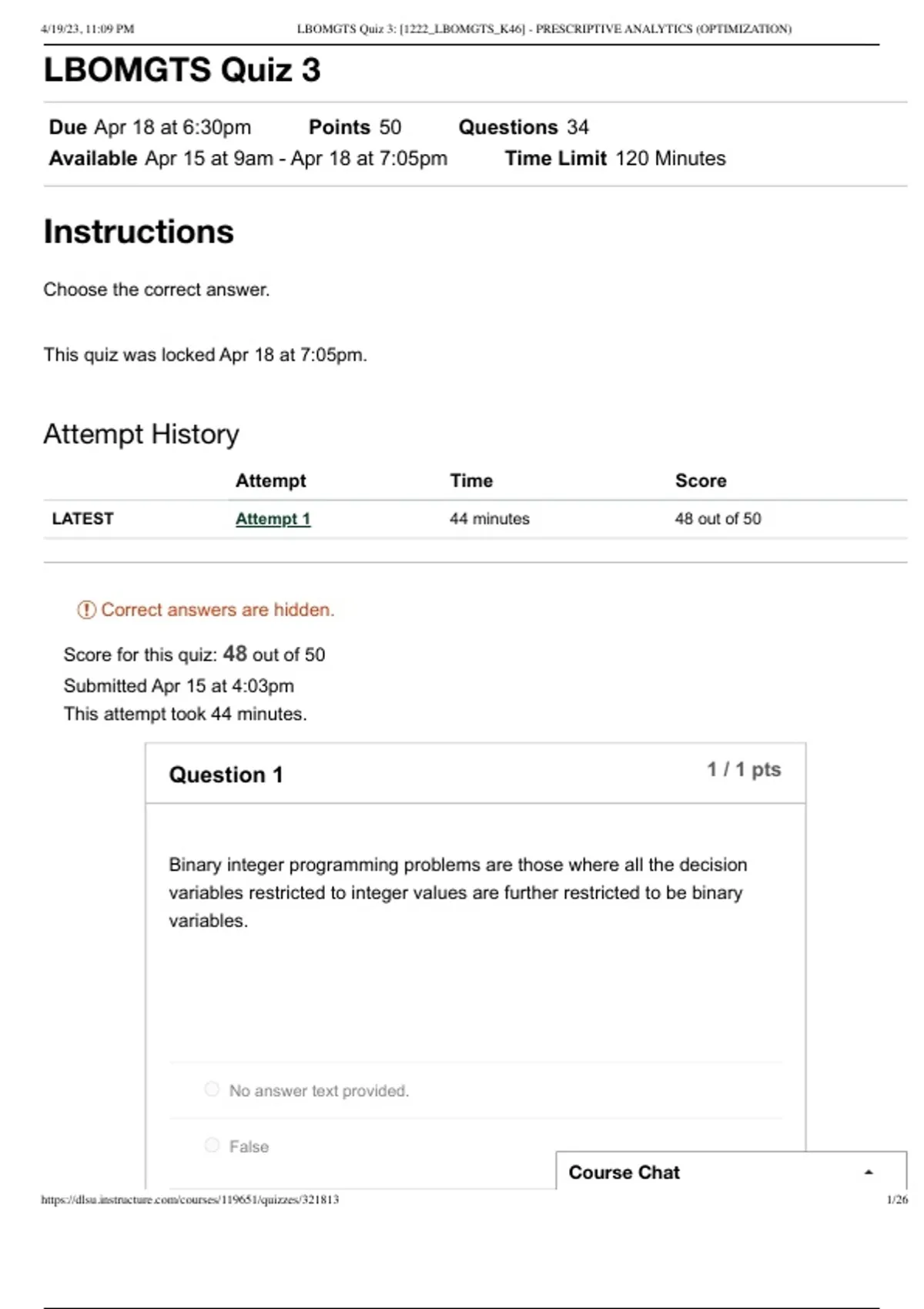 ,4/19/23, 11:09 PM LBOMGTS Quiz 3: [1222_LBOMGTS_K46] - PRESCRIPTIVE ANALYTICS (OPTIMIZATION)