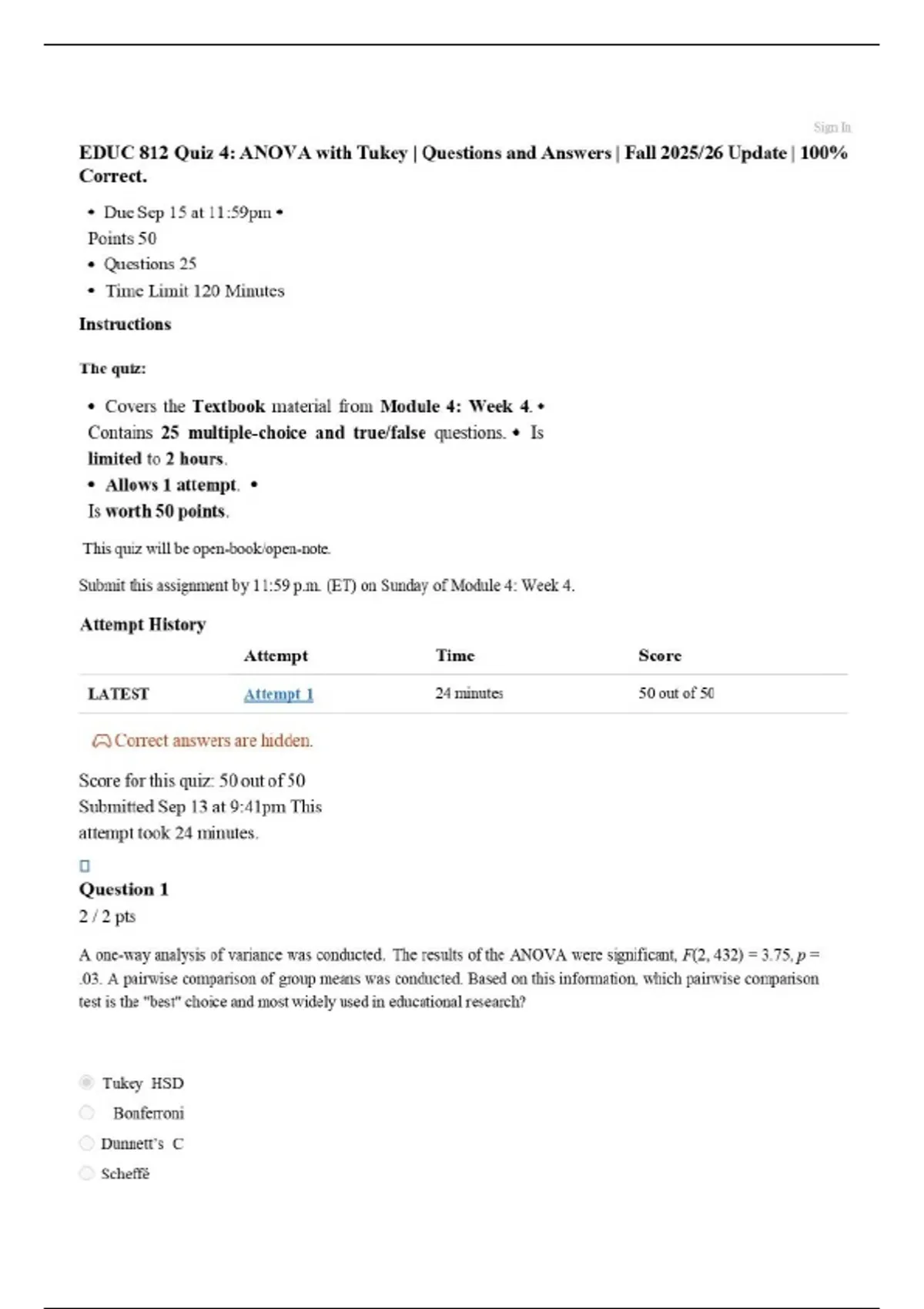 EDUC 812 Quiz 4: ANOVA with Tukey | Questions and Answers | Fall 2025/26 Update | 100% Correct.
