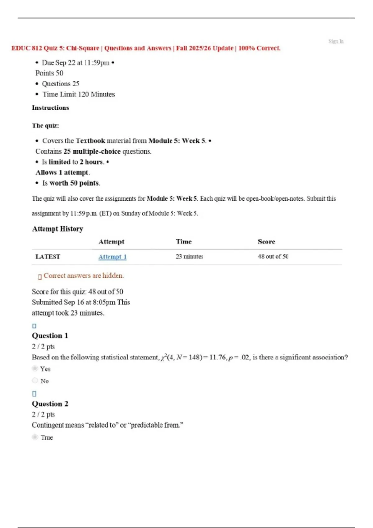 EDUC 812 Quiz 5: Chi-Square | Questions and Answers | Fall 2025/26 Update | 100% Correct.