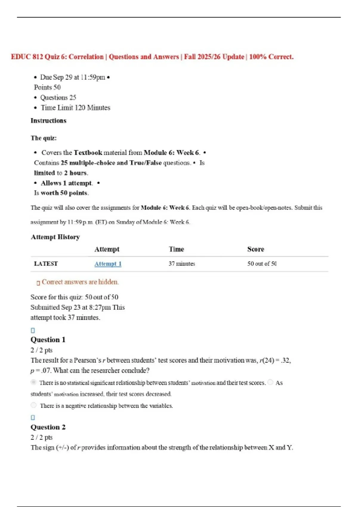 EDUC 812 Quiz 6: Correlation | Questions and Answers | Fall 2025/26 Update | 100% Correct.