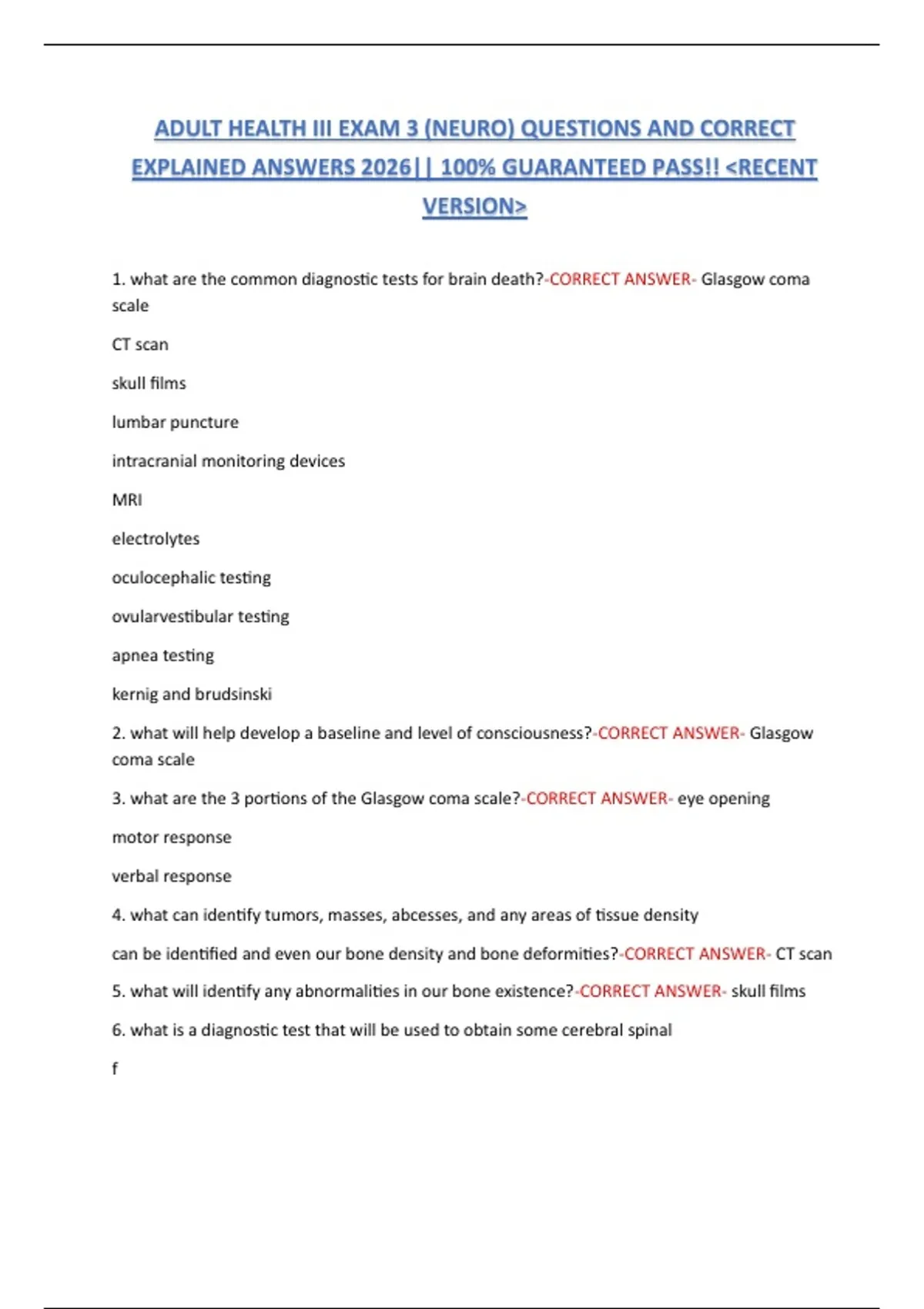 1. what are the common diagnostic tests for brain death?-CORRECT ANSWER- Glasgow coma