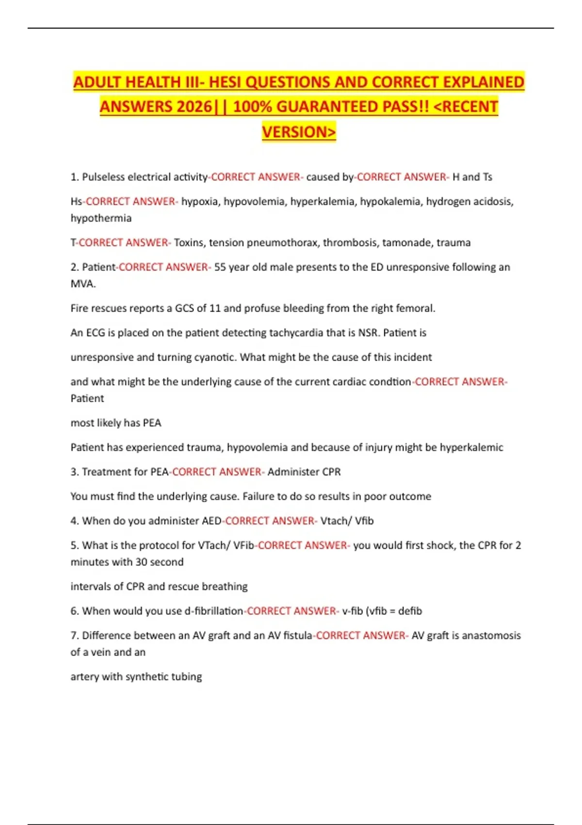 ADULT HEALTH III- HESI QUESTIONS AND CORRECT EXPLAINED ANSWERS 2026|| 100% GUARANTEED PASS!! <RECENT VERSION>