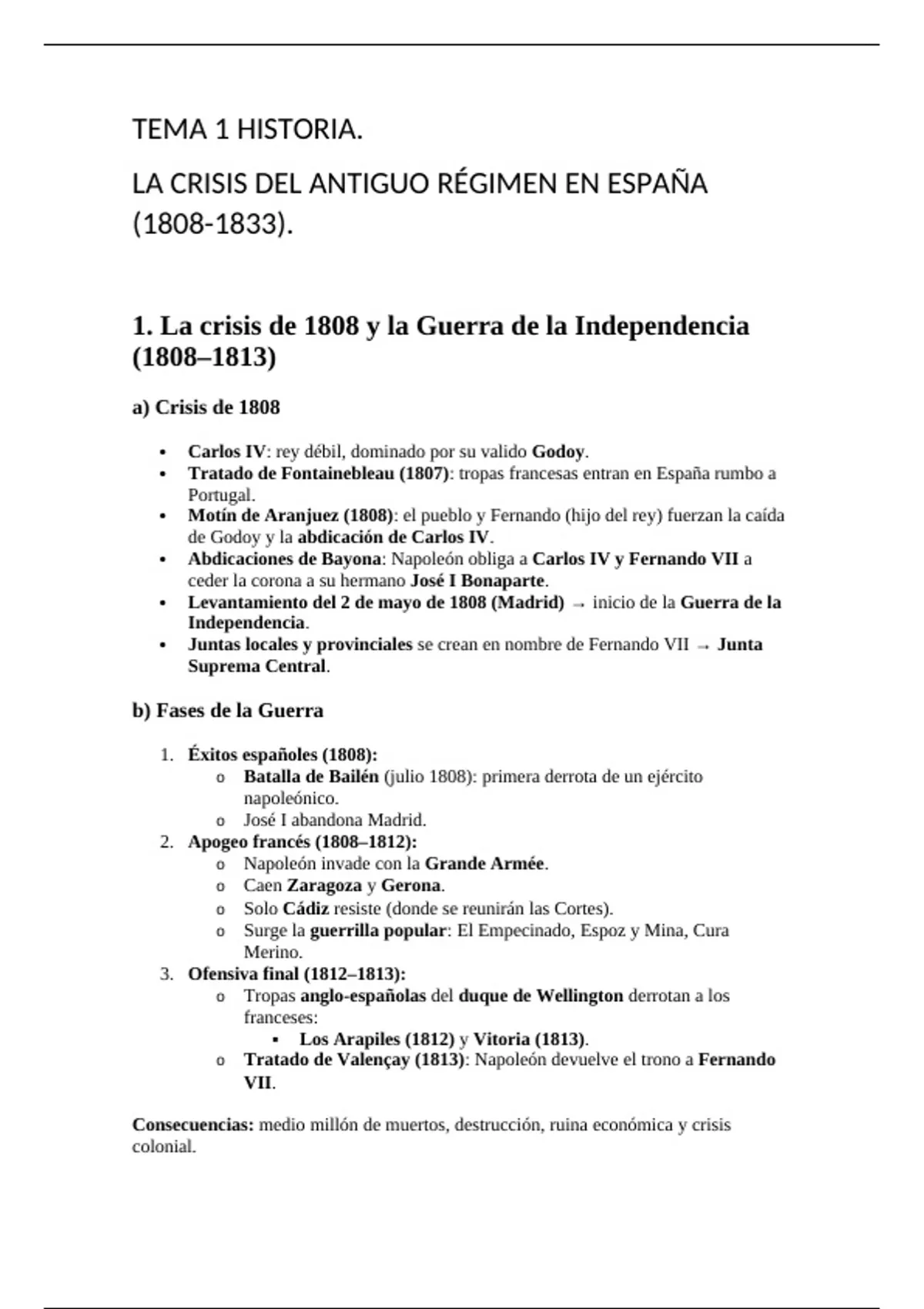 -La crisis de 1808 y la guerra de la independencia. -La guerra de la Independencia. -La revolución liberal. -Las cortes de Cádiz. -La constitución de 1812. -La labor legislativa de las cortes. -Restablecimiento de las cortes. El trienio liberal. -Década absolutista. -Emancipación América española. -La gloriosa. -Gobierno provisional. Constitución de 1969. -Regencia de Serrano. -Reinado de Amadeo de Saboya. -Primera república. República de Serrano. -Agricultura y sus cambios. -Evolución siglo XIX. -Industria textil algodonera. -Industria siderúrgica. -Minería. -Ferrocarril. -Del estamentalismo a la sociedad de clases.