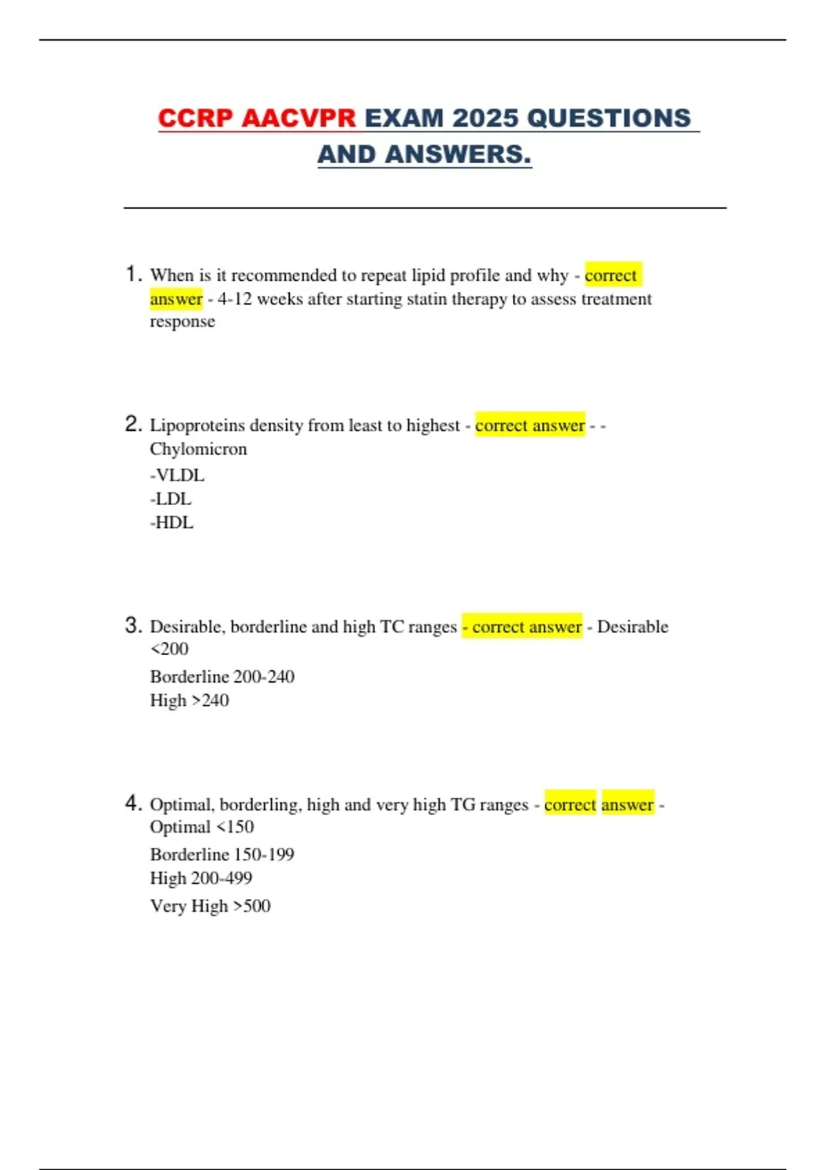 This document provides a full set of CCRP AACVPR exam questions with verified correct answers, covering lipid profiles, statin therapy, diabetes management, nutrition, smoking cessation, psychosocial considerations, and exercise guidelines. It summarizes essential clinical values, diagnostic criteria, and evidence-based recommendations relevant to cardiac rehabilitation practice. The content is structured to support efficient study and exam preparation.
