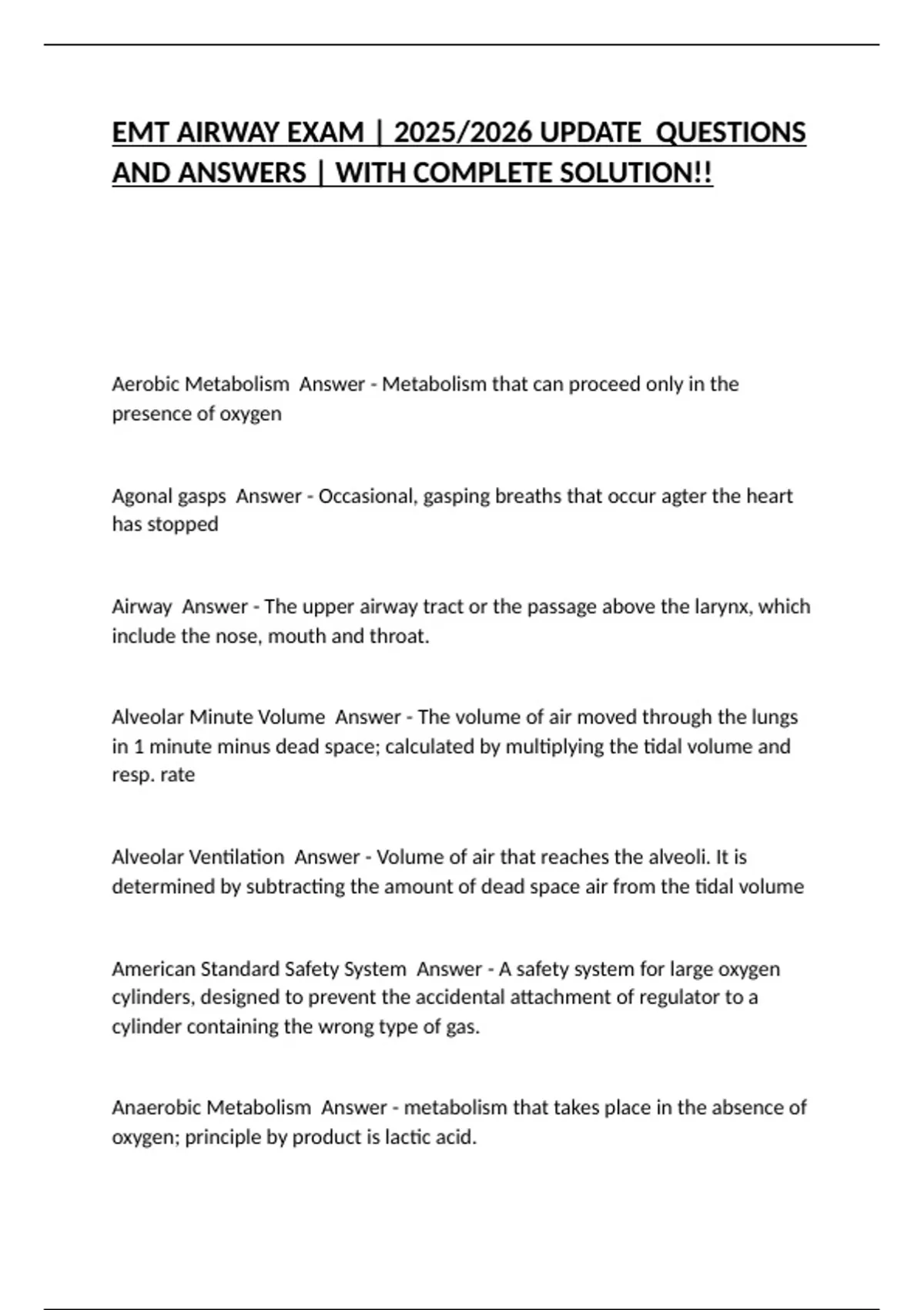 EMT AIRWAY EXAM | 2025/2026 UPDATE QUESTIONS AND ANSWERS | WITH COMPLETE SOLUTION!!