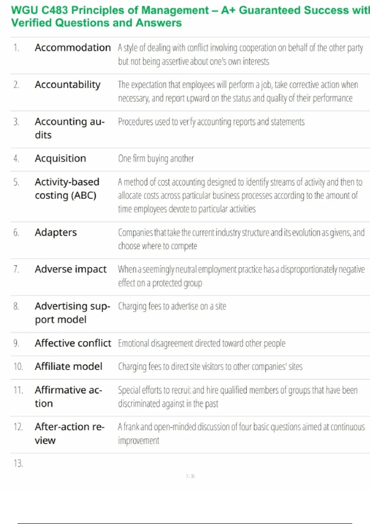 This WGU C483 Principles of Management study guide is designed to help students master essential management concepts and perform confidently on the objective assessment. It includes verified questions and clearly explained answers covering planning, organizing, leading, and controlling, along with leadership styles, motivation theories, organizational structure, strategic management, ethics, and decision-making. Carefully aligned with WGU C483 course competencies, this guide supports focused study and exam readiness. Ideal for business students and aspiring managers, it strengthens managerial thinking and provides a reliable pathway to guaranteed success and A+-level performance.