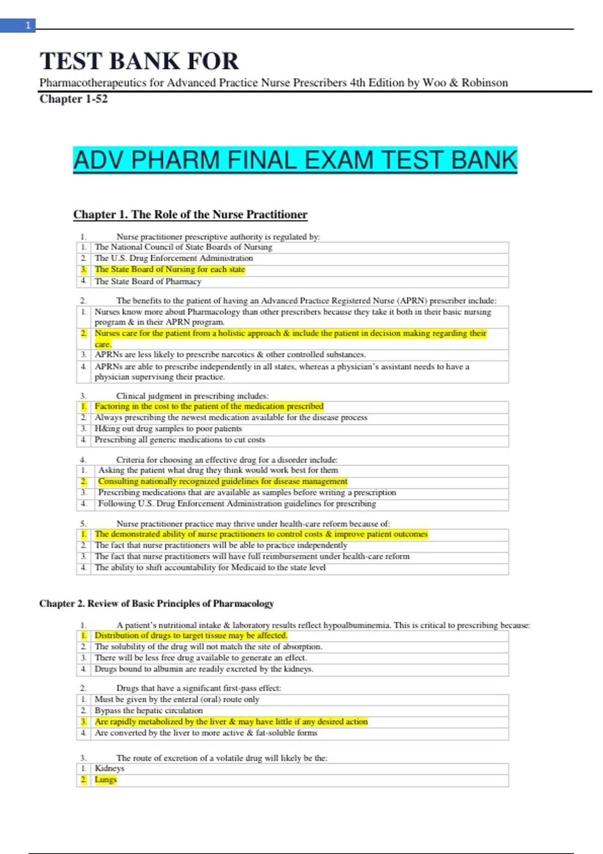 This document contains a complete test bank for Pharmacotherapeutics for Advanced Practice Nurse Prescribers (4th Edition) by Woo & Robinson, covering chapters 1 through 52. It includes exam-style questions designed to support advanced practice nursing students in mastering pharmacology concepts, clin