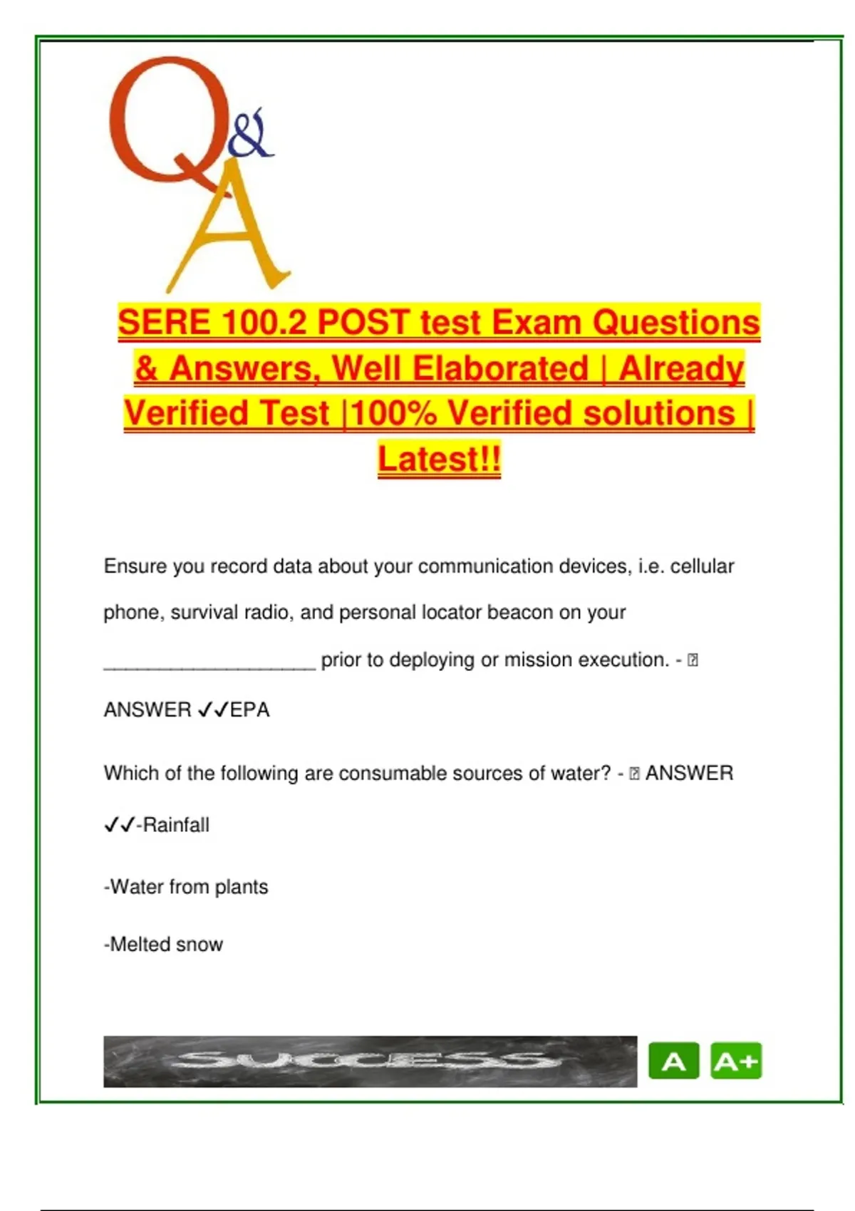 This document includes 60+ thoroughly verified and well-explained multiple-choice and true/false questions and answers based on the SERE 100.2 Post-Test—Survival, Evasion, Resistance, and Escape. Fully aligned with the 2025–2026 military training cycle, it is essential for service members preparing to certify or recertify in SERE compliance, particularly those deploying to high-risk environments. The content covers real-world application of U.S. military doctrine and Code of Conduct articles, with an emphasis on operational survival skills, ethical behavior under captivity, and procedures for recovery and reintegration. Answers are matched directly with the training objectives outlined in DoD SERE standards. Topics include: Article I–VI of the Code of Conduct (e.g., “keeping faith,” lawful resistance, authorized communication) Evasion Plan of Action (EPA) elements and recovery point preparation Visual signaling (contrast, size, ratio), use of disguise, and hole-up security Situational awareness using the PAID-E model Interrogation resistance and proof of life strategies Physical and psychological coping in captivity TCS water sources, food preparation, and proper wound care in survival Reintegration phases I–III and U.S. government support post-recovery Uniformed Code of Military Justice (UCMJ) responsibilities during isolation This guide is ideal for: Military personnel preparing for deployment or SERE requalification Students in military science, ROTC, or defense-related academic programs (e.g., MILS204) Special forces, aviation crew, or other high-risk units Military trainers, instructors, and survival course developers By simulating real test structure and emphasizing operational readiness, this resource ensures both knowledge mastery and mission applicability in survival and recovery scenarios. Keywords: SERE 100.2, Code of Conduct, military survival, evasion plan, EPA, recovery phases, captivity resistance, interrogation, visual signals, water sources, PAID-E model, MILS204, military reintegration, proof of life, tactical survival, wound care, field sanitation, TCS food