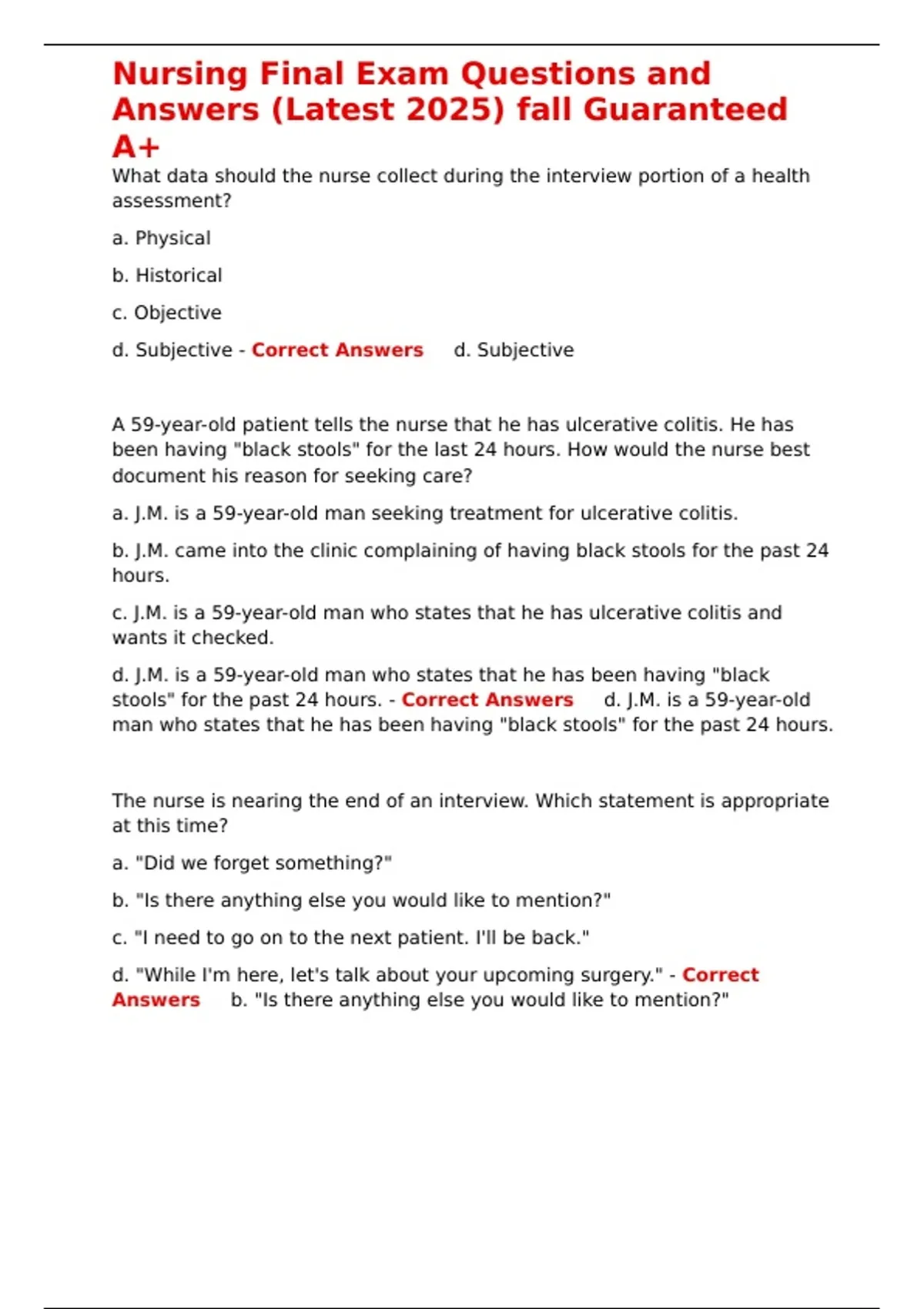 Nursing Final Exam Questions and Answers (Latest 2025) fall Guaranteed A+.