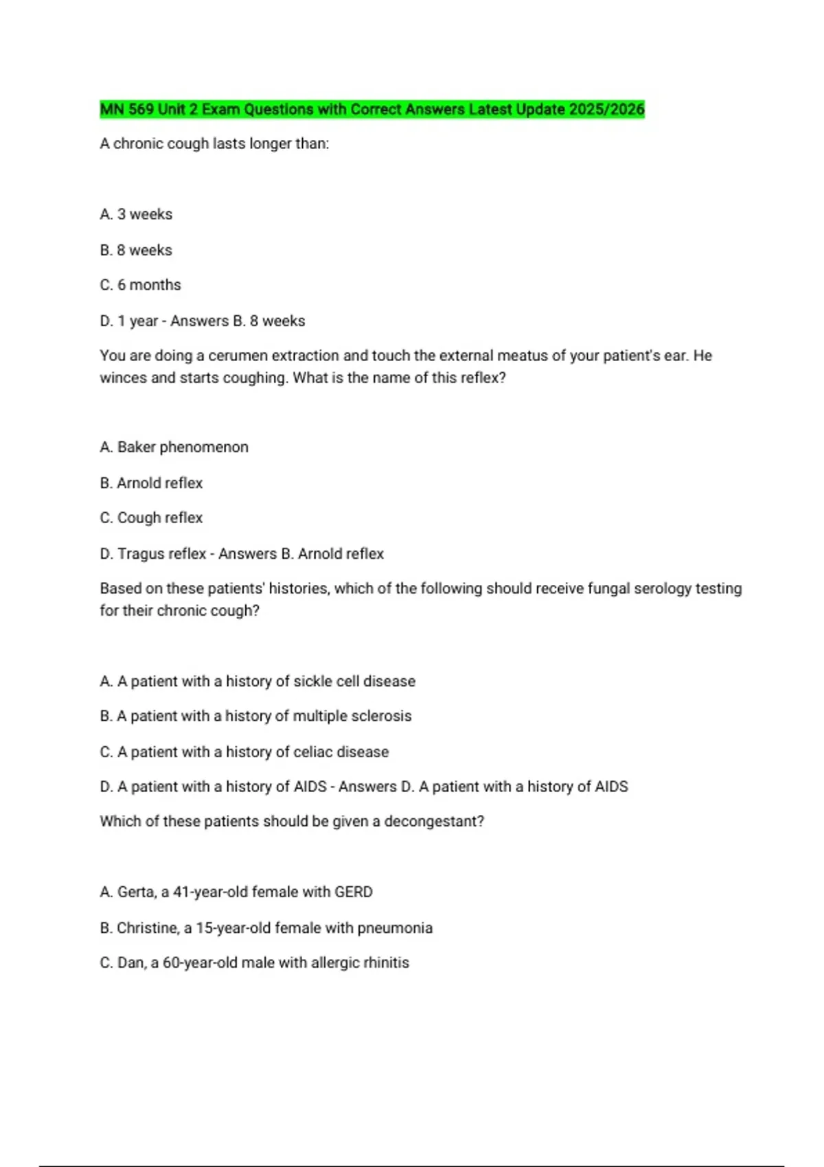 MN 569 Unit 2 Exam Questions with Correct Answers Latest Update 2025/2026 A chronic cough lasts longer than: A. 3 weeks B. 8 weeks C. 6 months D. 1 year - Answers B. 8 weeks You are doing a cerumen extraction and touch the external meatus of your patient's ear. He winces and starts coughing. What is the name of this reflex? A. Baker phenomenon B. Arnold reflex C. Cough reflex D. Tragus reflex - Answers B. Arnold reflex Based on these patients' histories, which of the following should receive fungal serology testing for their chronic cough? A. A patient with a history of sickle cell disease B. A patient with a history of multiple sclerosis C. A patient with a history of celiac disease D. A patient with a history of AIDS - Answers D. A patient with a history of AIDS Which of these patients should be given a decongestant? A. Gerta, a 41-year-old female with GERD B. Christine, a 15-year-old female with pneumonia C. Dan, a 60-year-old male with allergic rhinitis D. Andy, a 26-year-old with cystic fibrosis - Answers C. Dan, a 60-year-old male with allergic rhinitis Which of the following herbal supplements should be used cautiously in a patient with hypertension? A. Licorice B. Horehound C. Peppermint D. Jasmine - Answers A. Licorice A patient with hypertension comes in and insists that one of his new medications is causing him to cough. When looking at his list of medications, you think the cough must be from: A. Metoprolol B. Clopidogrel C. Tadalafil D. Captopril - Answers D. Captopril Lisa is a 25-year-old Hispanic female experiencing chest tightness, a feeling of suffocation, and feels like she "can't get air in." She has no current history of heart or lung disease and did not exercise leading up to this attack. Which of the following is the most likely cause for this dyspnea? A. Severe chronic anemia B. Congestive heart failure C. Anxiety-related dyspnea D. Chronic obstructive pulmonary disease (COPD) - Answers C. Anxiety-related dyspnea Which of the following scales is useful to assess the degree of dyspnea with a score of 6 to 20? A. Borg scale B. Patient Health Questionnaire-9 scale C. Visual analog scale D. Global assessment of functioning scale - Answers A. Borg scale