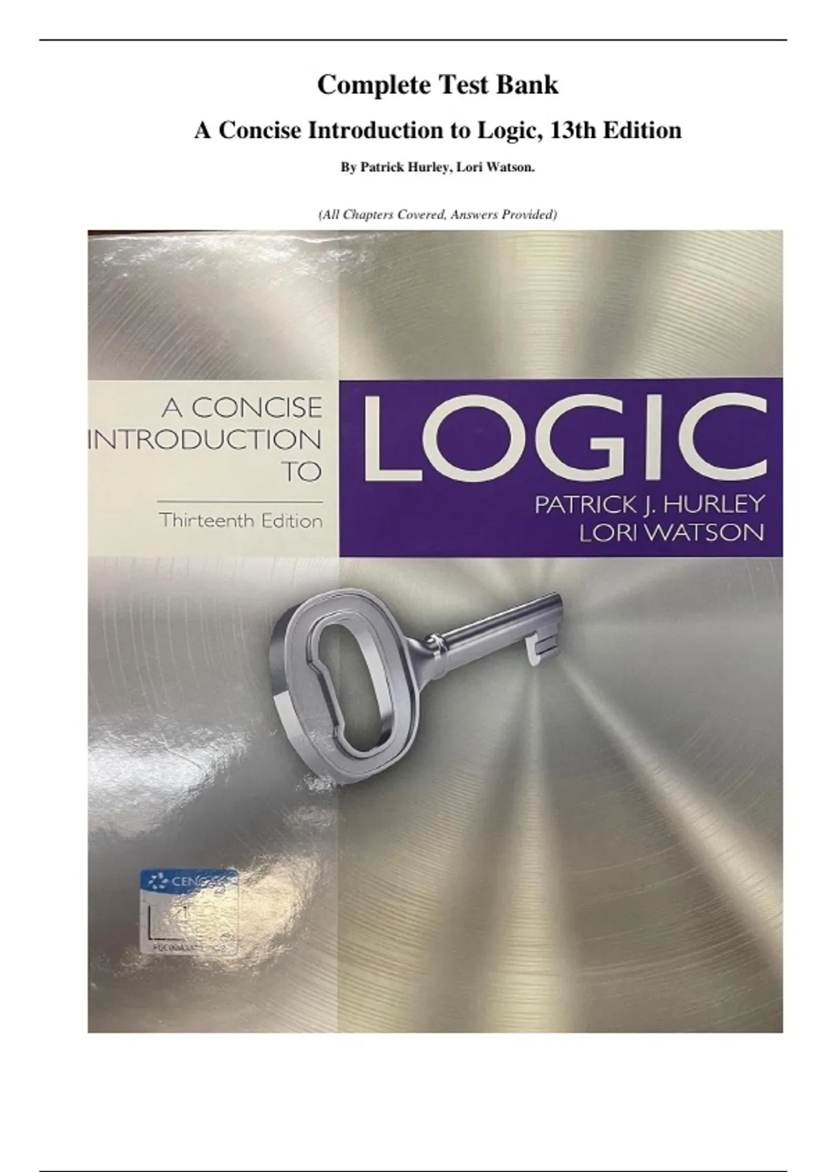 Complete Test Bank A Concise Introduction to Logic, 14th Edition. By Patrick Hurley, Lori Watson. (All Chapters Covered, Answers Provided) Over a million students have learned to be more discerning at constructing and evaluating arguments with the help of Hurley's A CONCISE INTRODUCTION TO LOGIC. The text's clear, student-friendly and thorough presentation has made it the most widely used logic text in North America. Studying logic offers multiple benefits. It helps you think through problems in an organized and systematic way. It instills patterns of reasoning that enable you to persuade others as to the correctness of your convictions, and it teaches you how to use language clearly and precisely. Doing well in logic improves your skills in ways that will help in your other courses, everyday life and future career. Additionally, for the 14th edition, the WebAssign online platform provides interactive exercises, online homework solutions, multimedia tutorials, help videos and the complete text in an eBook format.