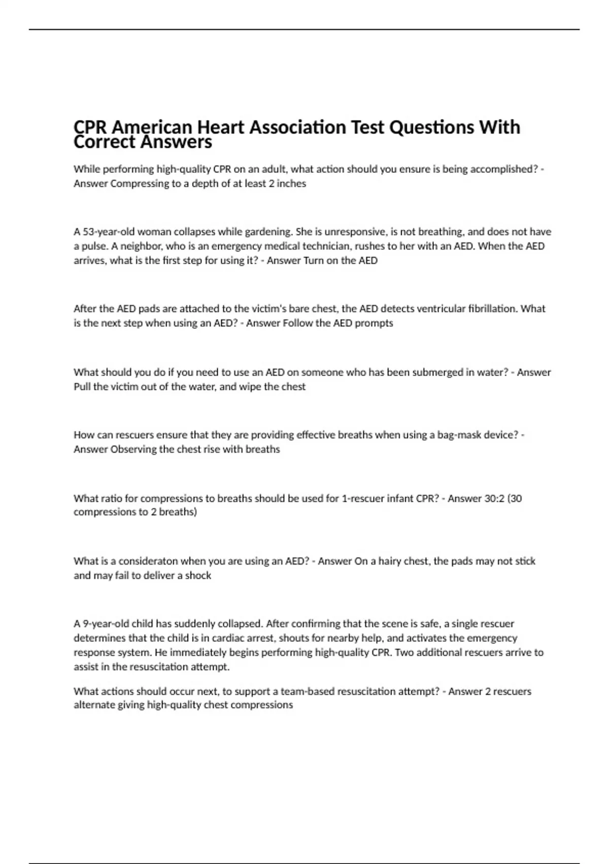 CPR American Heart Association Test Questions With Correct Answers, CPR Review Questions, American Heart Association CPR Test, CPR and AED Certification Exam, Cpr Reveiw, CPR Test (25 questions), CPR Test, American Heart Association CPR, CPR Test (25 questions) With Correct Answers