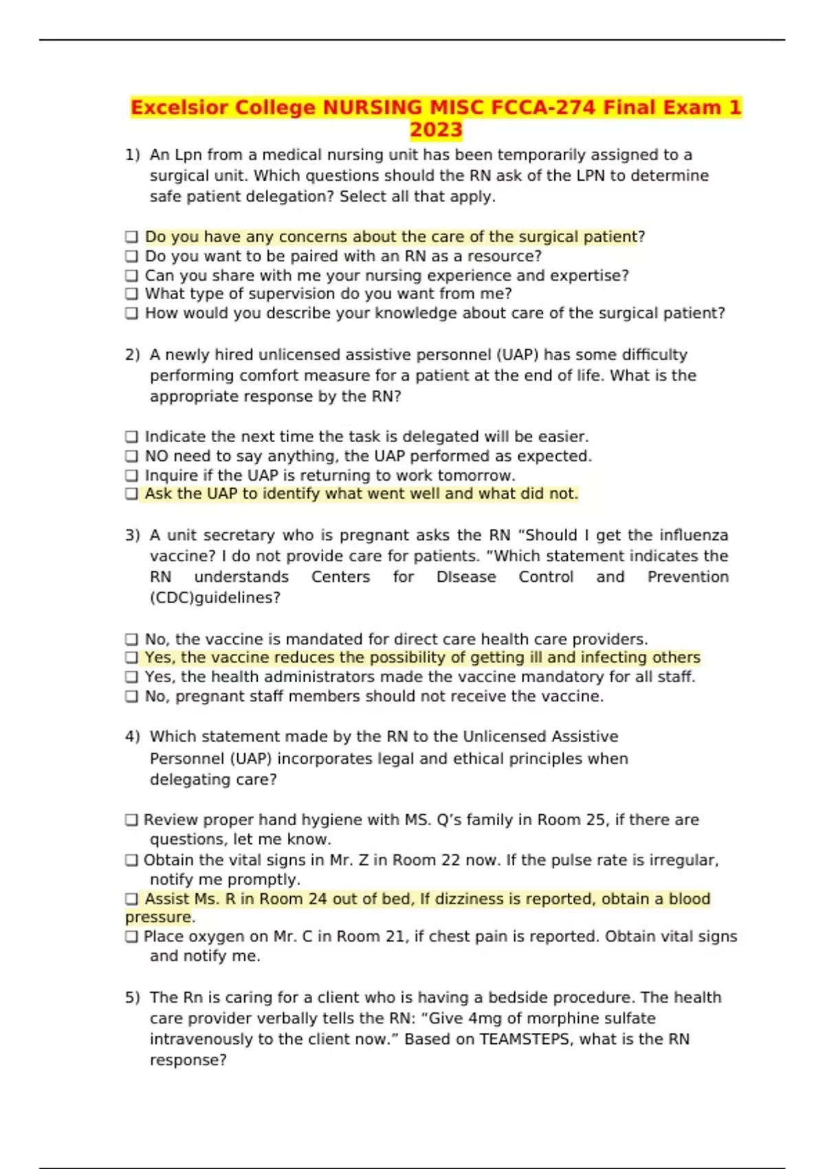 Excelsior College NURSING MISC FCCA-274 Final Exam 1 2023