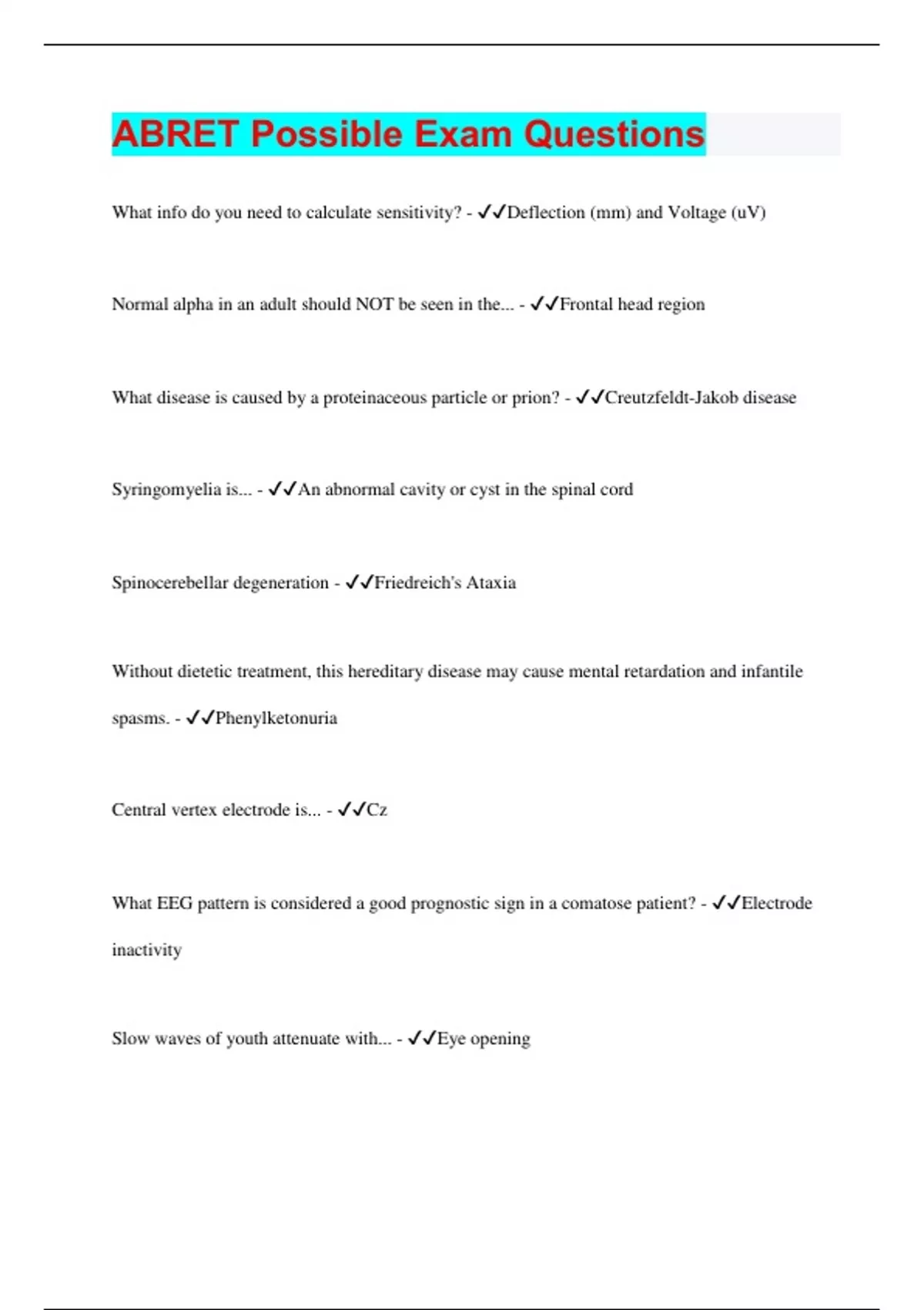 ABRET Normal/Abnormal Pediatric and Neonatal EEG | Questions with 100% Correct Answers | Verified