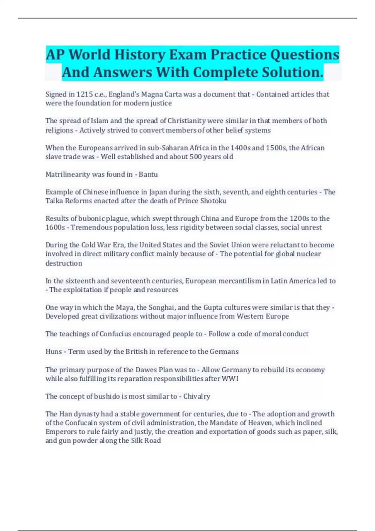 AP World History Exam Practice Questions And Answers With Complete Solution.