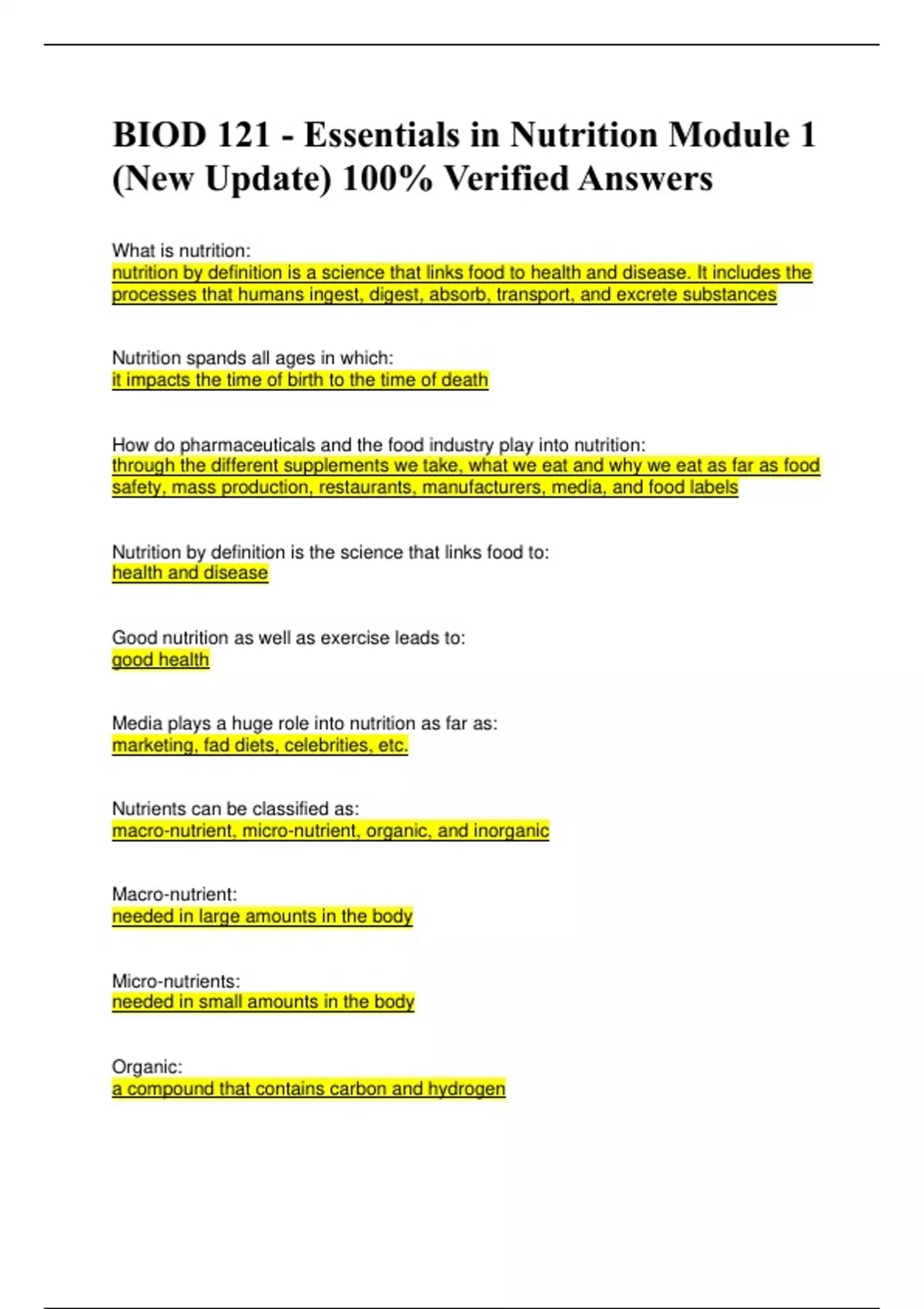 BIOD 121 Essentials in Nutrition Exams and Case Studies Questions and Answers Package Deal ( 100% Verified Elaborations)
