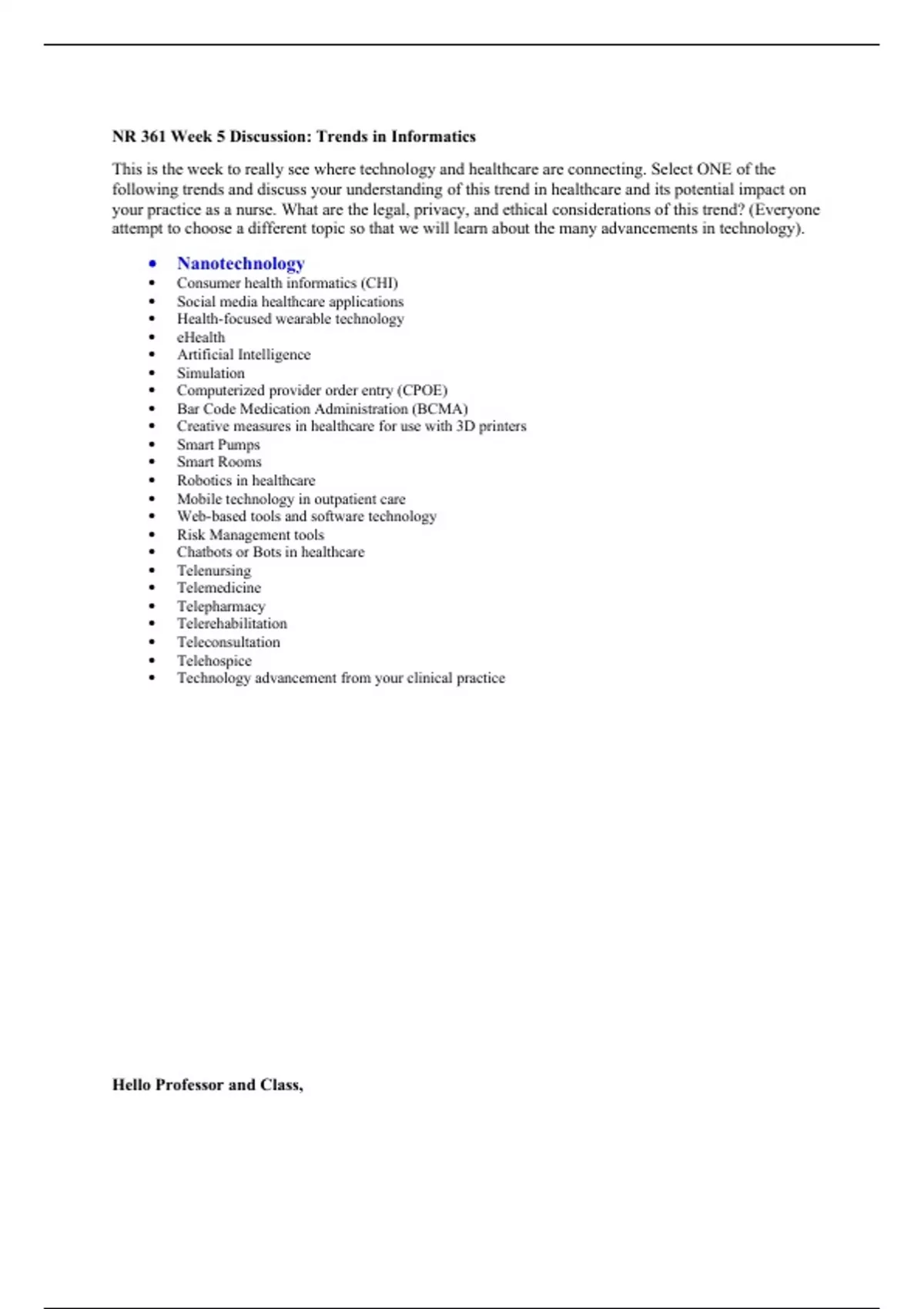 NR 361 Week 5 Discussion Trends in Informatics Nanotechnology Chamberlain
