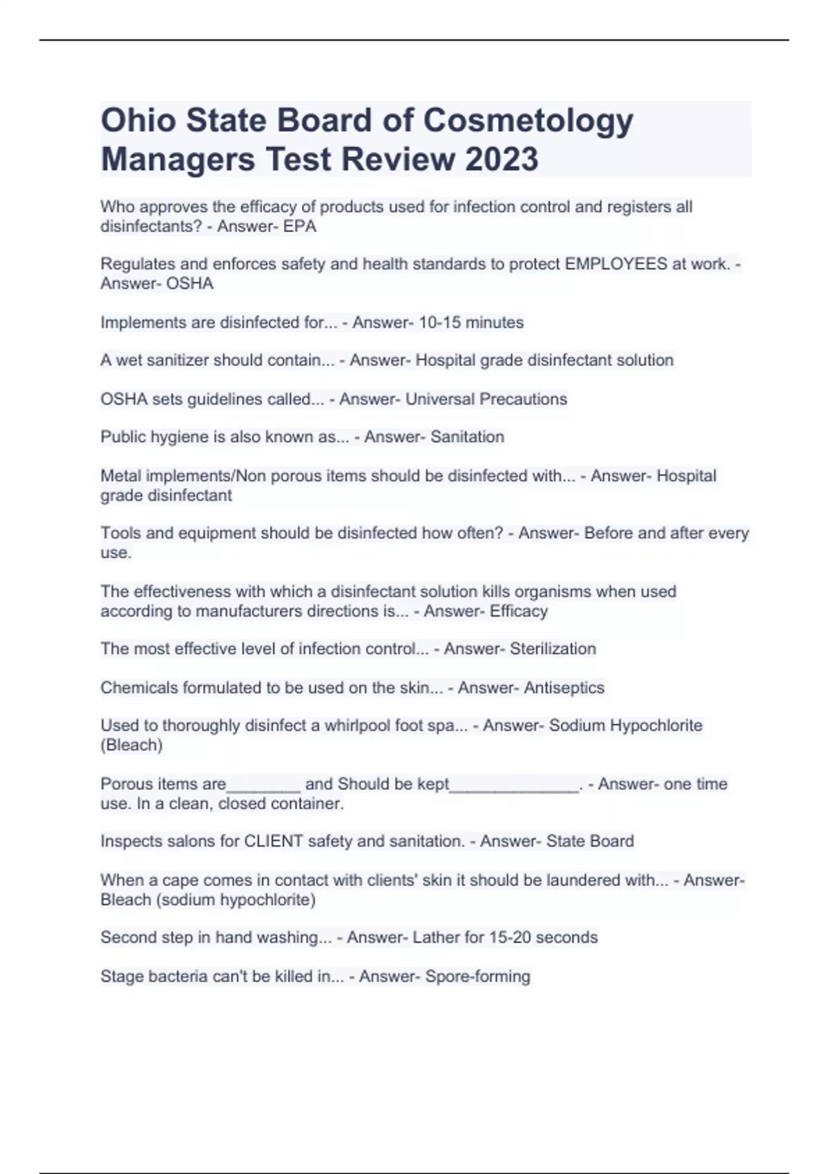 Ohio State Board of Cosmetology Managers Test Review 2023 MN Salon Manager Test with complete solutions MN Laws & Rules Exam Questions and Answers MN Salon Manager Laws & Rule Exam 2023 Minnesota Stat Exam 2023 Questions and Answers Mn cosmetology instructor laws and rules 2023 Exam Laws and Rules PSI Exam 2023 Questions with correct Answers