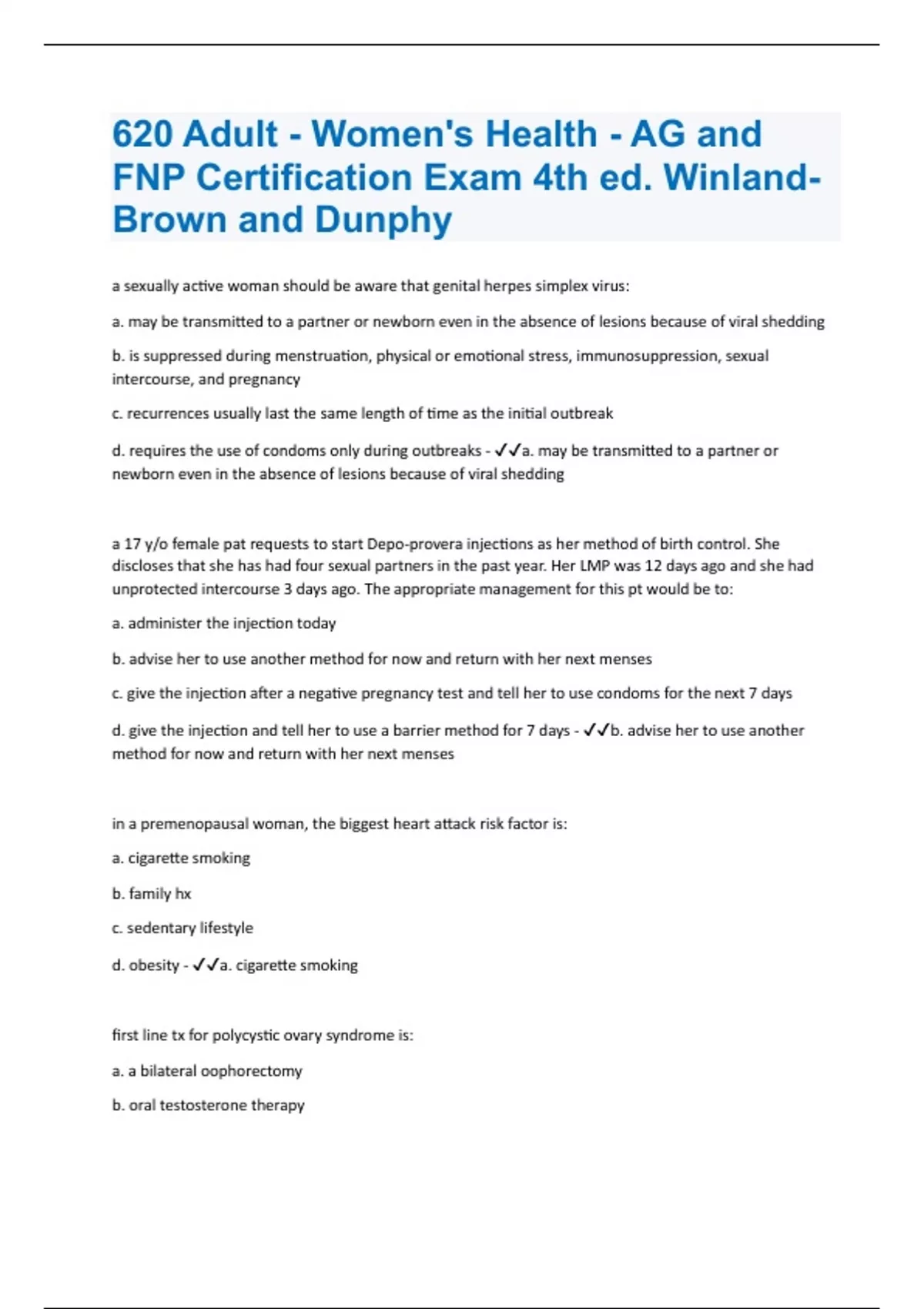 620 Adult - Women's Health - AG and FNP Certification Exam 4th ed. Winland-Brown and Dunphy | Questions with 100 % correct Answers | Verified