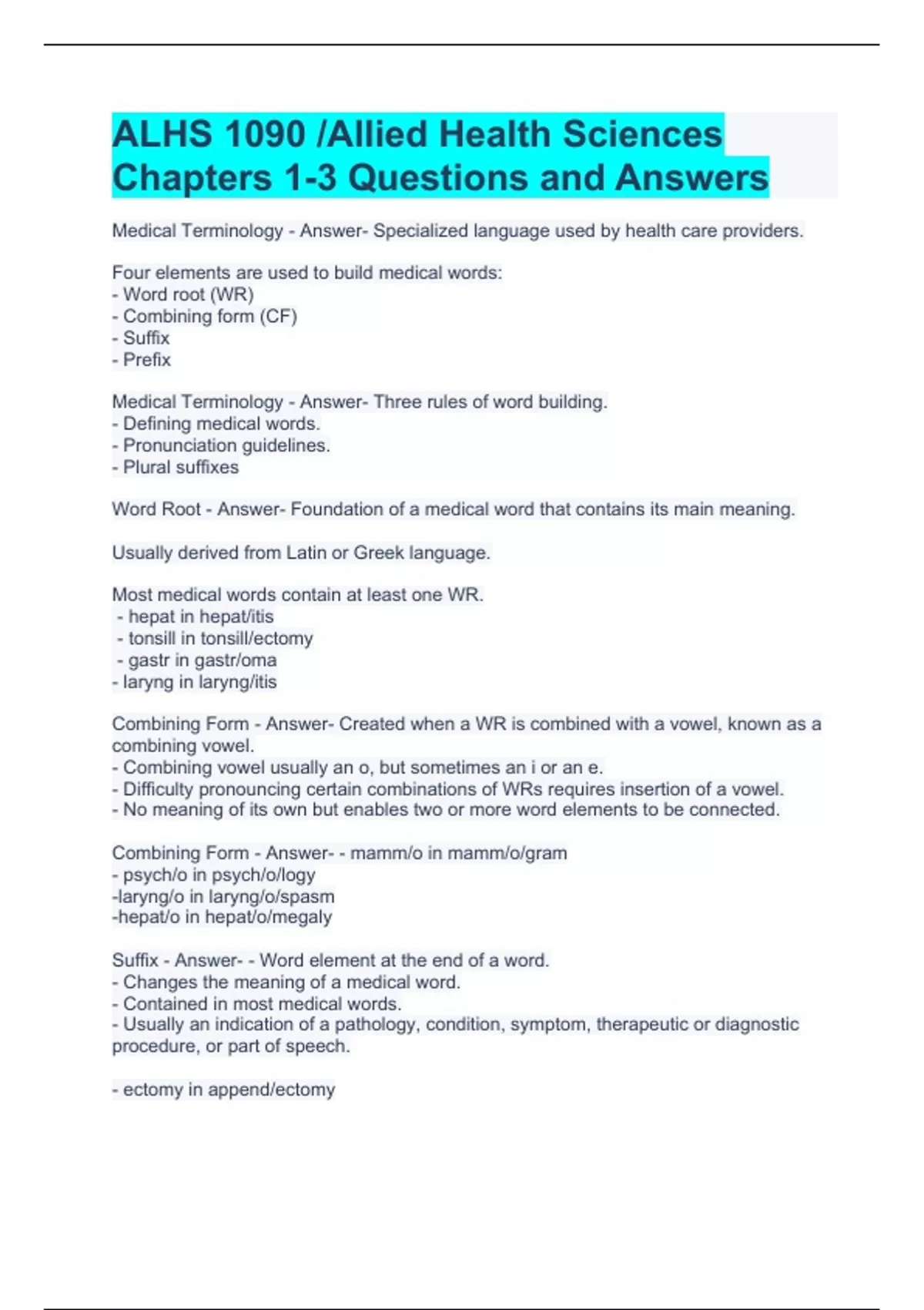 ALHS 1090 /Allied Health Sciences Chapters 1-3 Questions and Answers Chapter 8 ALHS 1090 Exam with complete solutions ALHS 1090 - Ch. 4 & 14 Quiz/Exam Bones Questions and Answers ALHS 1090 Unit 3 Exam with complete solutions ALHS 1090 - Exam 3 Study Guide latest updated ALHS 1090 Medical Terminology Exam Questions with correct Answers (Graded A)