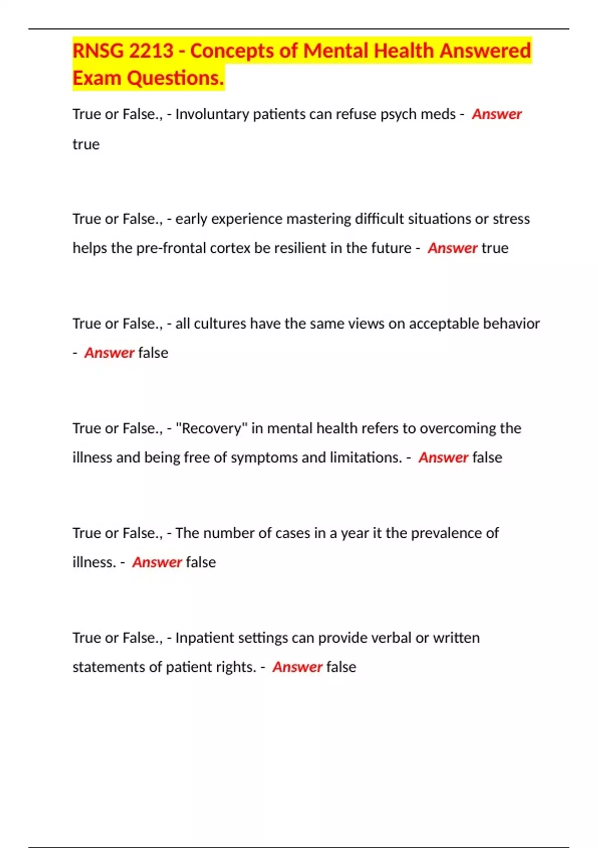 RNSG 2213 - Concepts of Mental Health Answered Exam Questions.