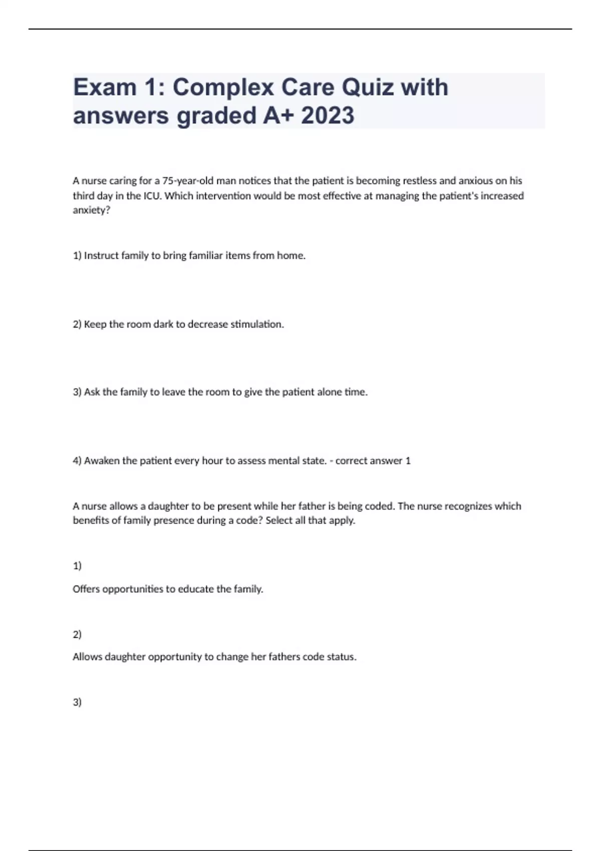 1 Exam (elaborations) Complex Care-Quiz 1 correctly answered rated A+ 2023 2 Exam (elaborations) Complex Care Midterm (2023 updated) well answered 3 Exam (elaborations) Complex Care Exam 1 question and answers rated A+ 2023 already passed 4 Exam (elaborations) Exam 1 N471 Complex Care question with correctly answered rated A+ 2023 5 Exam (elabo
