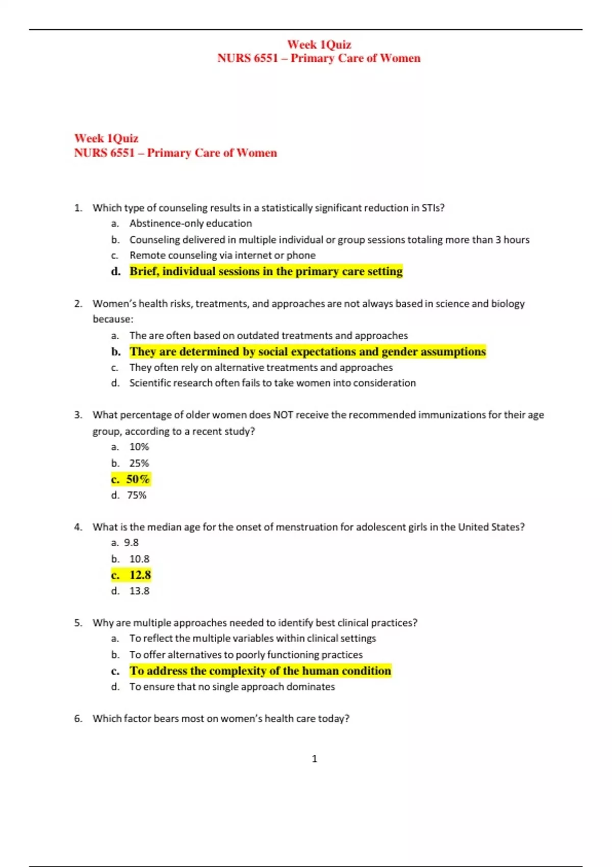 Which type of counseling results in a statistically significant reduction in STIs? a. Abstinence-only education b. Counseling delivered in multiple individual or group sessions totaling more than 3 hours c. Remote counseling via internet or phone d. Brief, individual sessions in the primary care setting 2. Women’s health risks, treatments, and a
