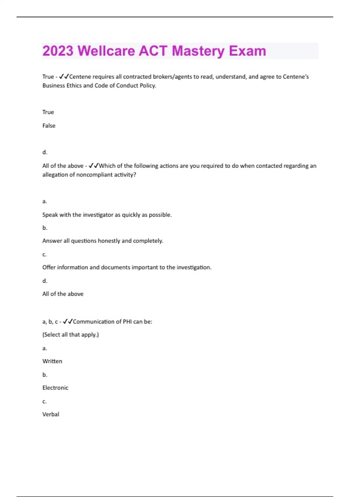 Centene ACT Mastery Exam| Questions with 100% correct Answers | Verified