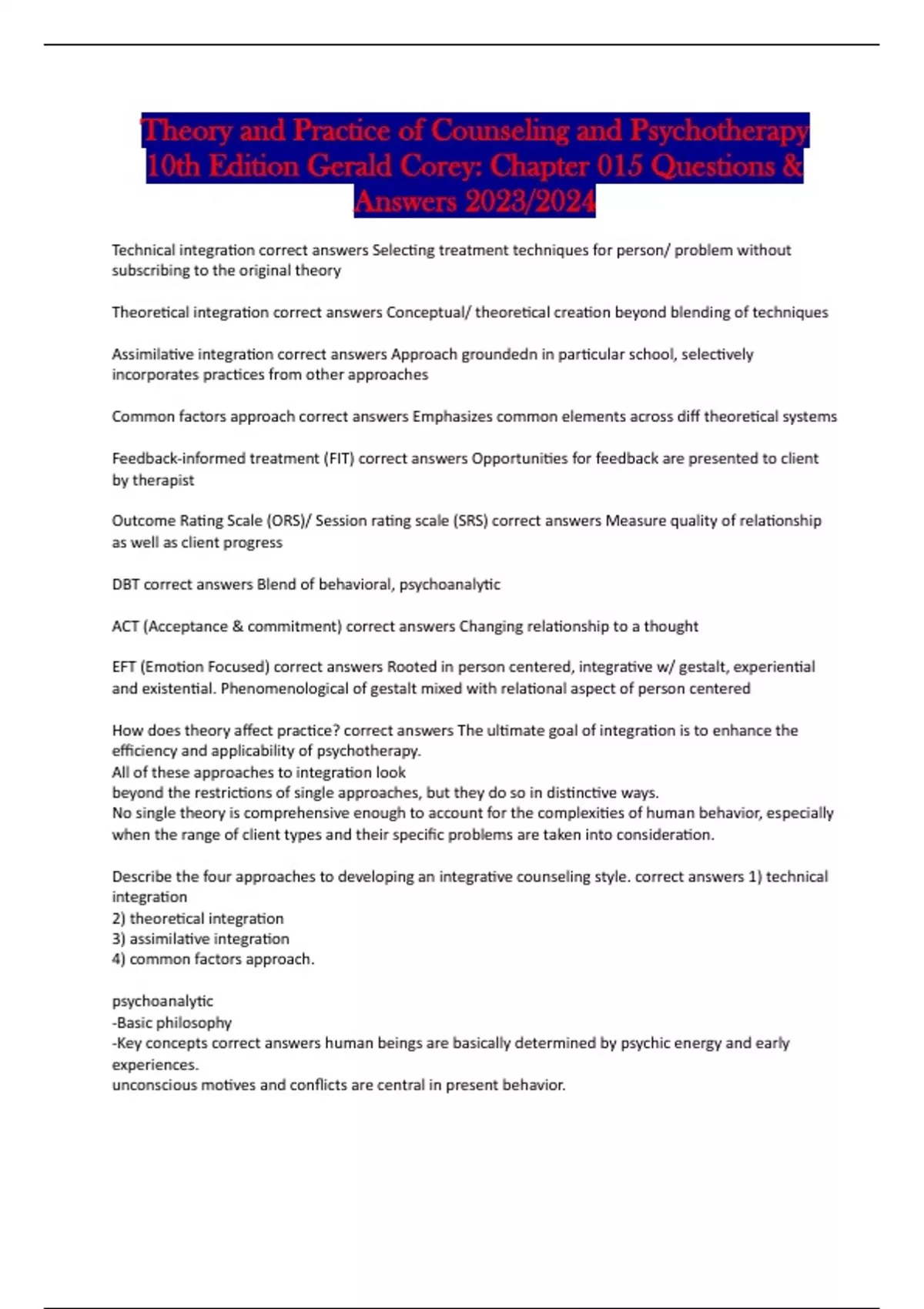 Theory and Practice of Counseling and Psychotherapy 10th edition Gerald Corey: BUNDLED Test quiz Banks with Complete Solution 2023/2024