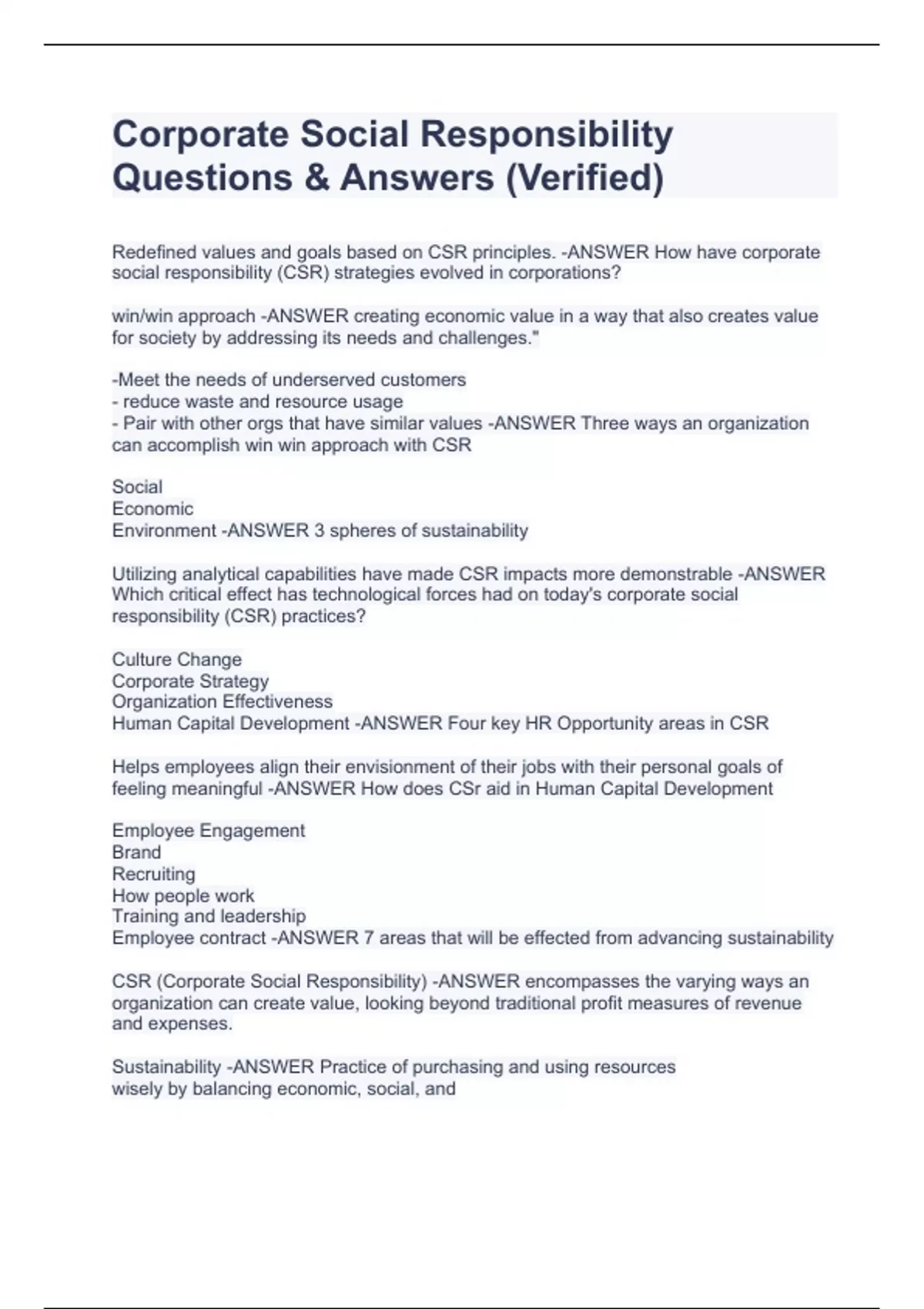 Corporate Social Responsibility Exam Questions With CORRECT Solutions