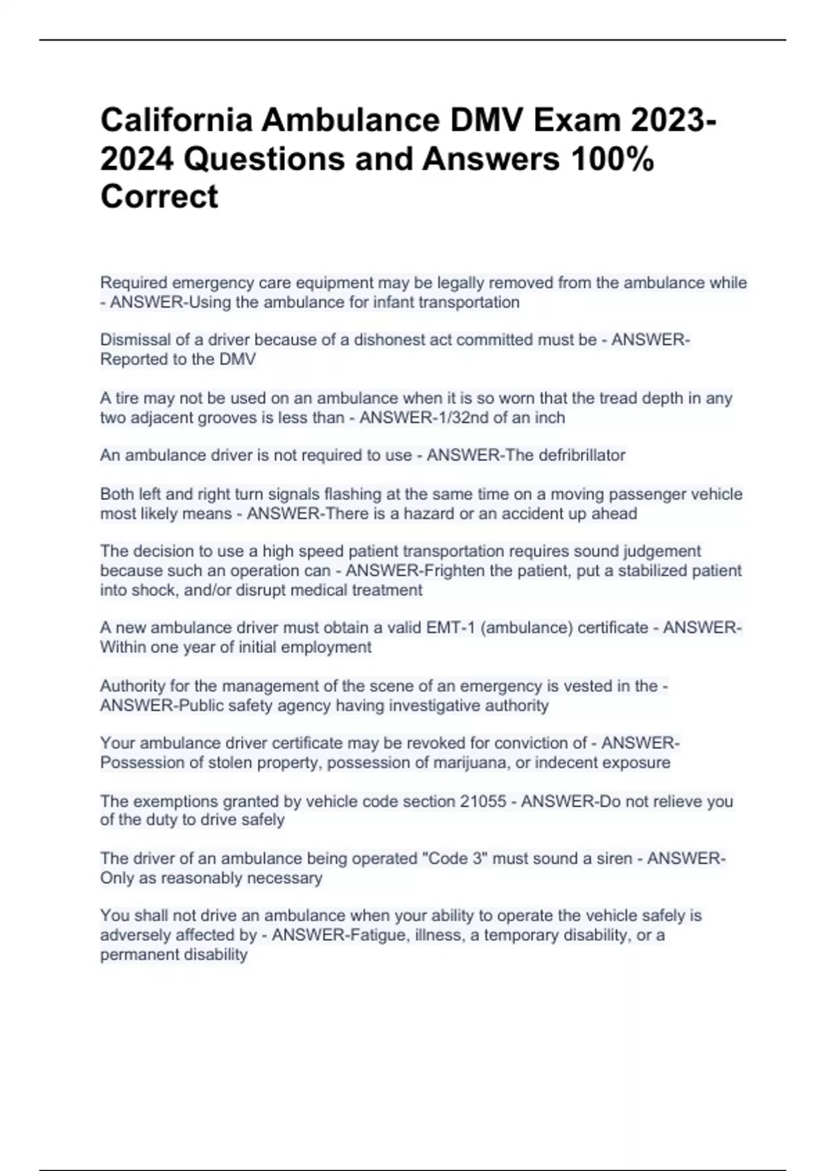 California Ambulance DMV Exams BUNDLE WITH Complete Questions and Answers 100% Correct