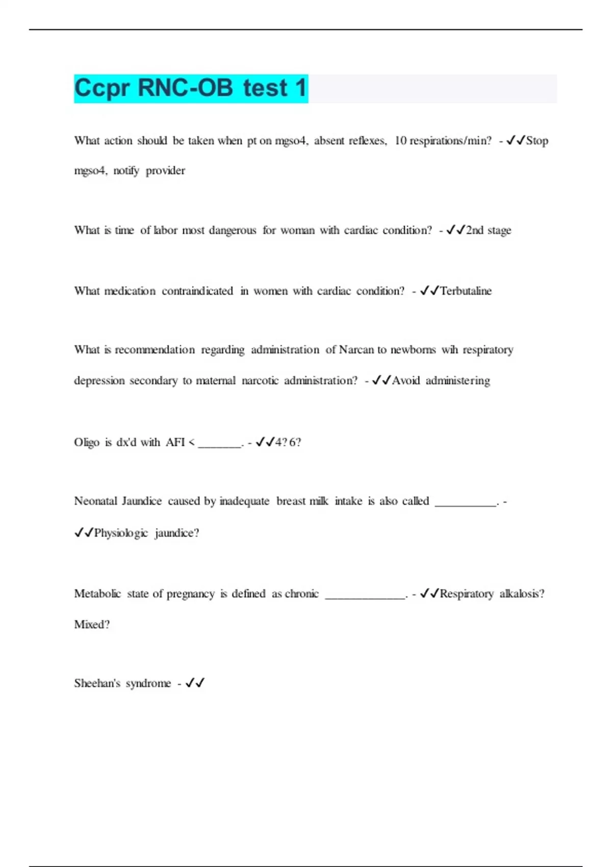 Ccpr RNC-OB test 1 | 42 Questions with 100% Correct Answers | Verified